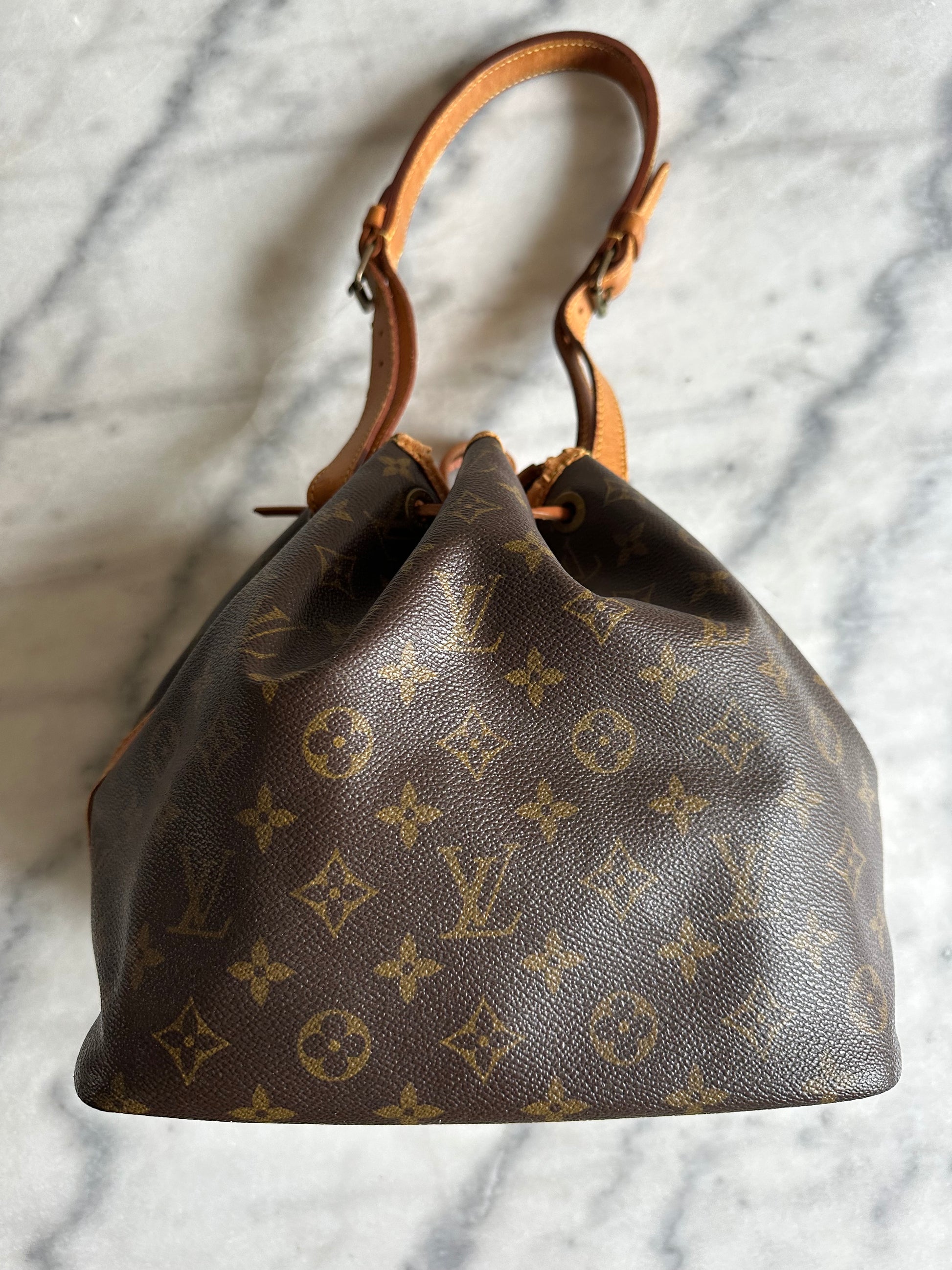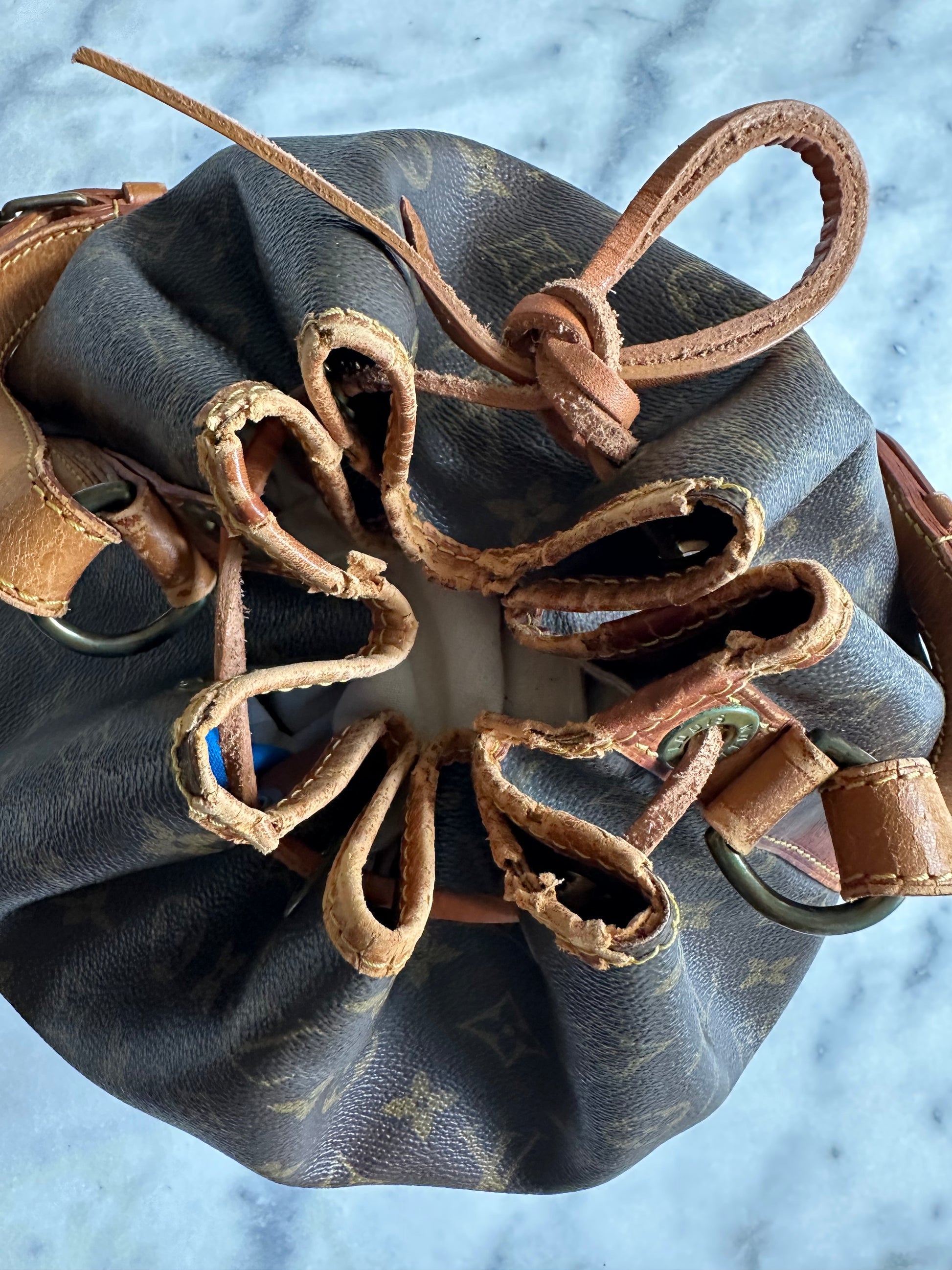 Beautiful vintage Louis Vuitton petit Noe in brown leather. Some wear to the leather and the lining. Some wear to the rim. Some watermarks on the bottom and the strap. The inside is clean. The date code is readable. Overall still in good condition.