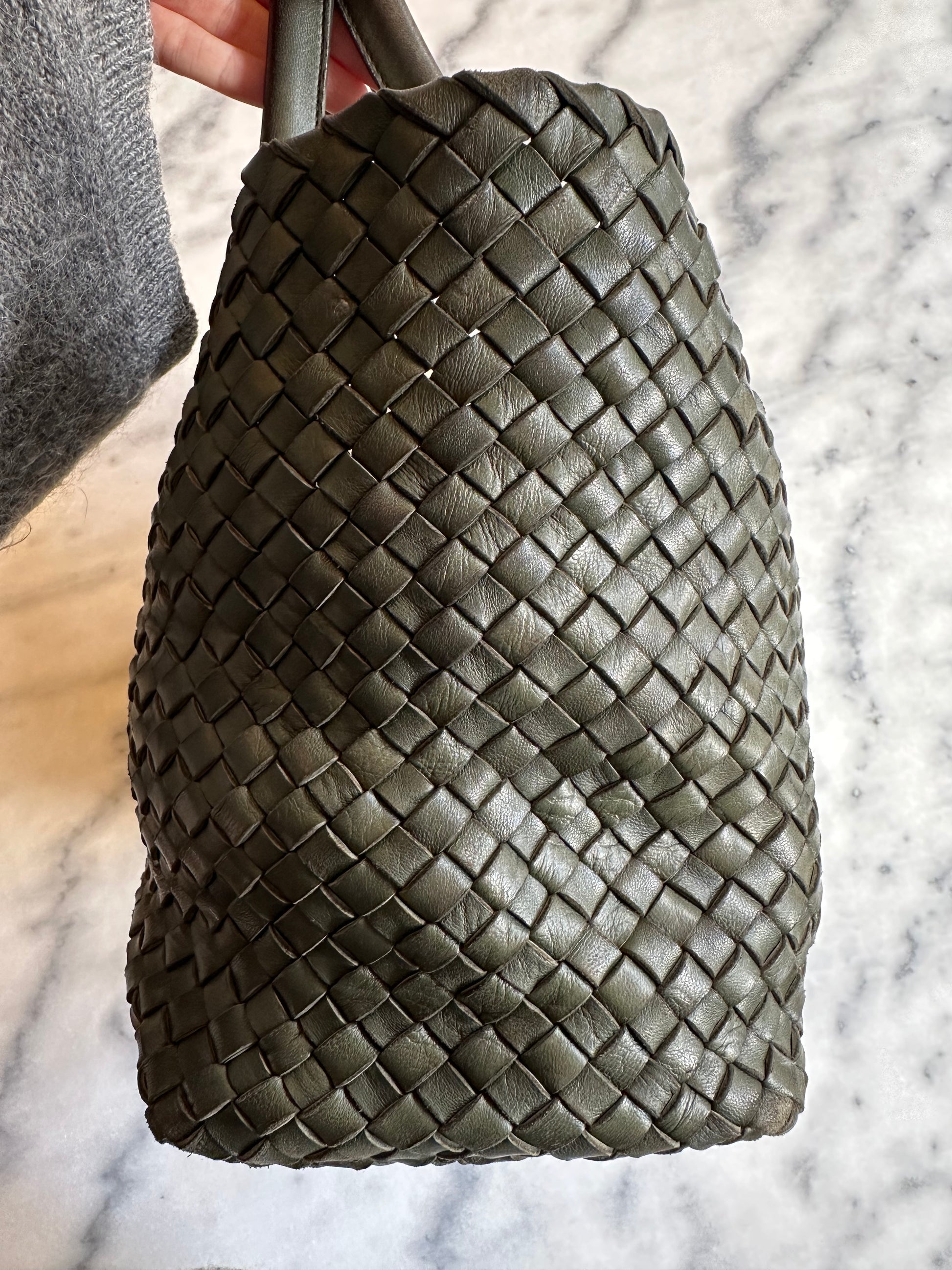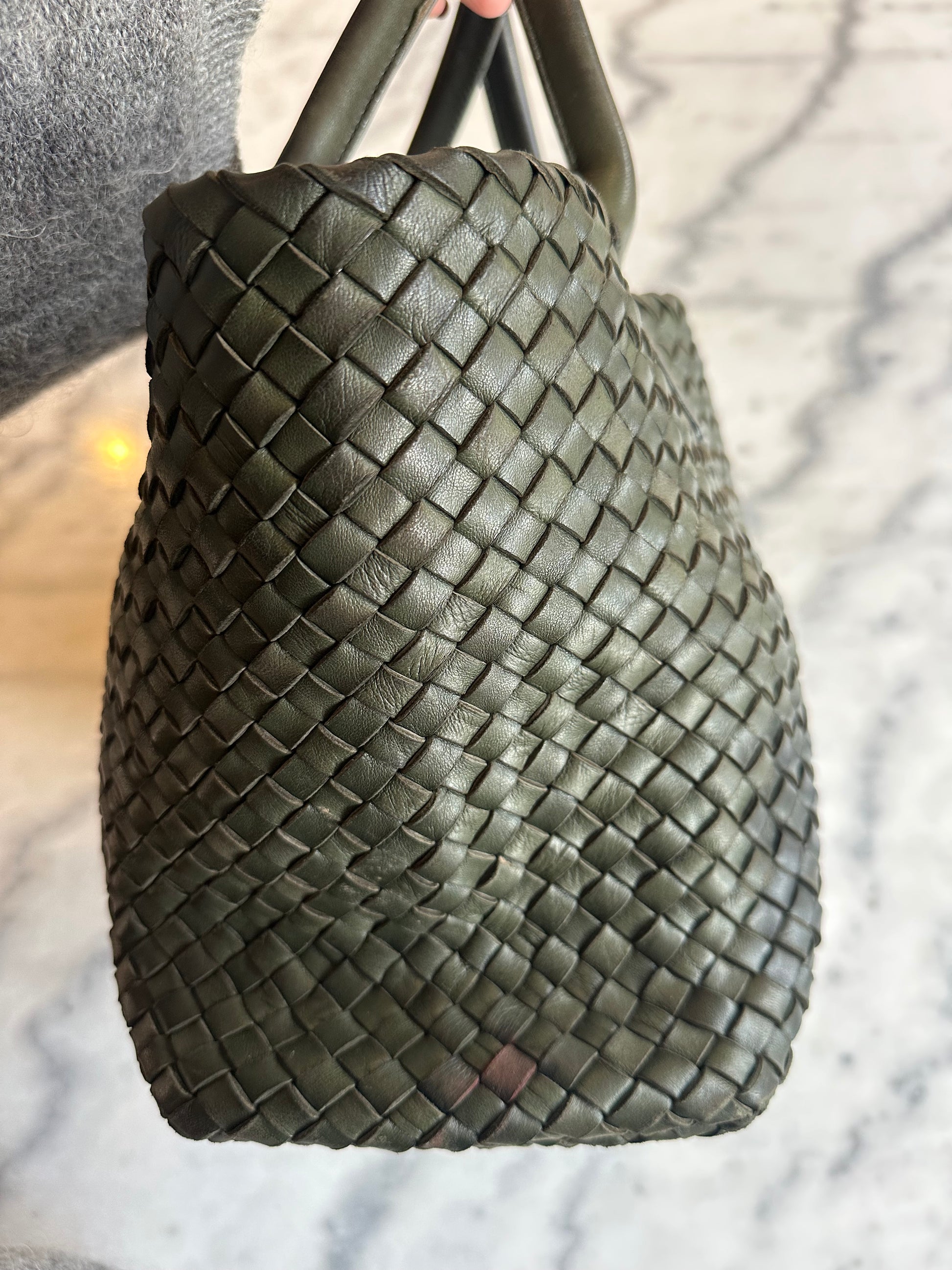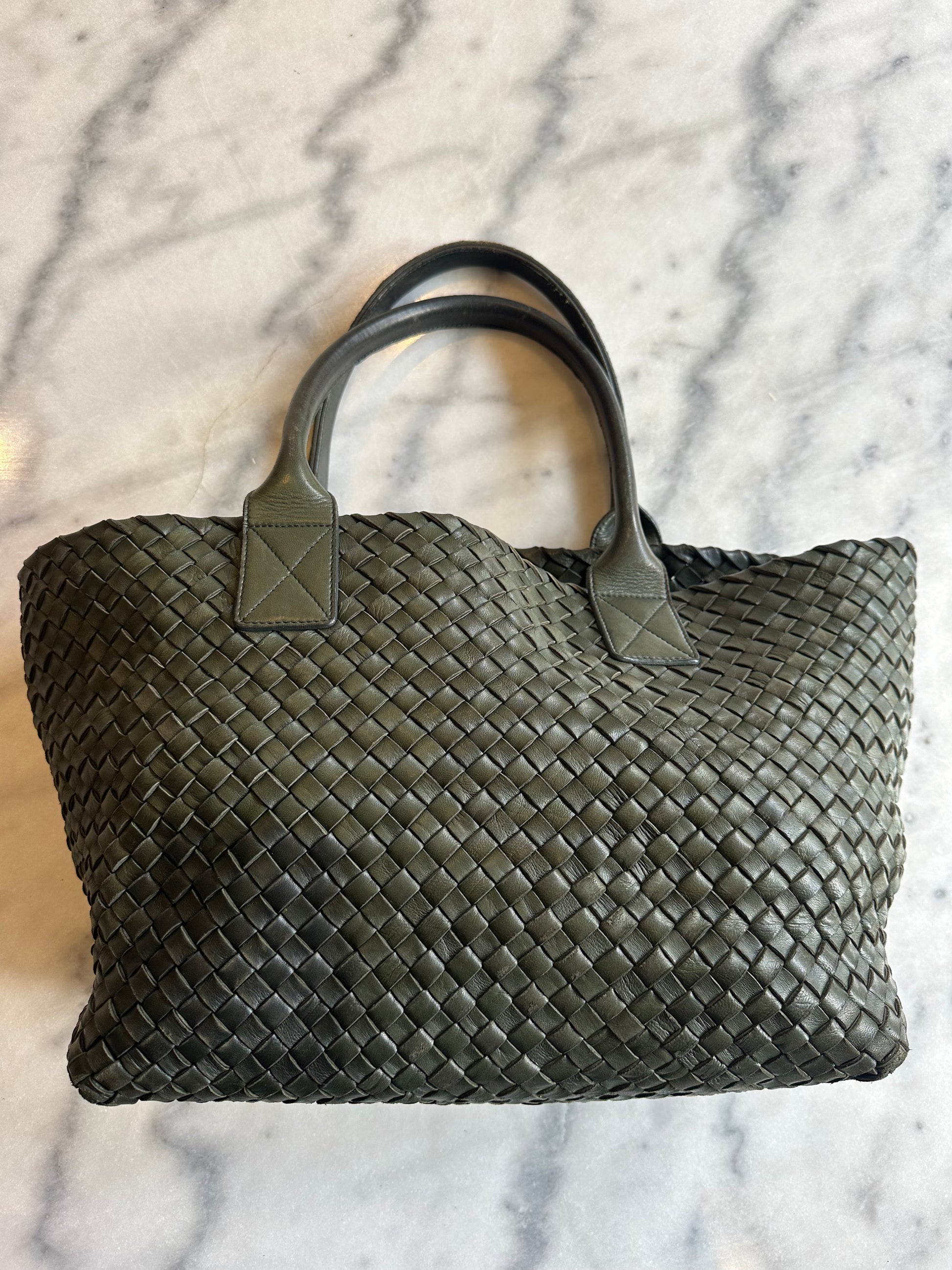 Beautiful vintage Bottega Veneta bag Cabat in green woven leather. There are a lot of signs of wear to the bag. Small wear to the corners and the handle and a little discoloring. Overall still a beautiful bag. Comes without dustbag and box.