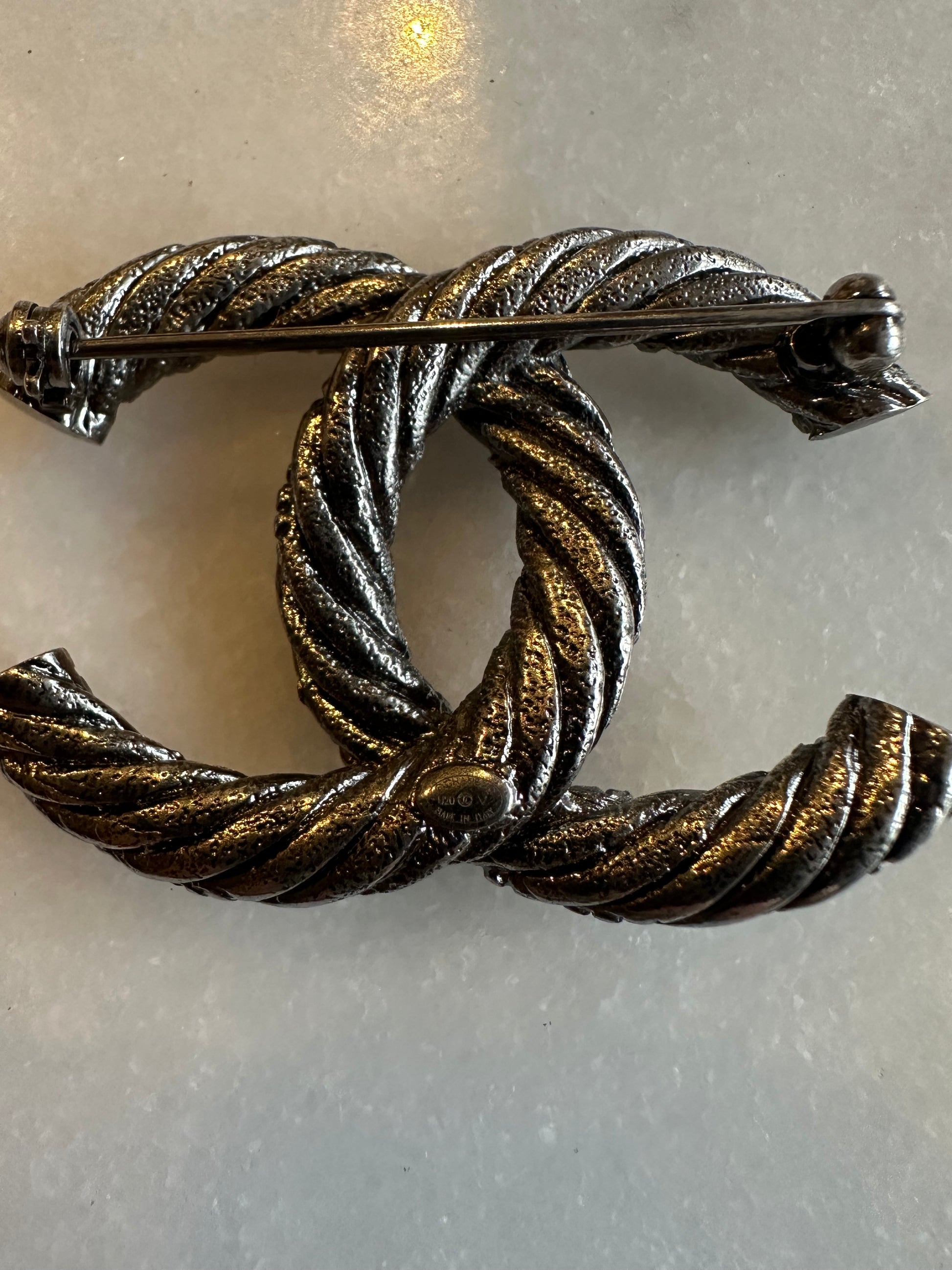Beautiful Chanel broche in silver metal. It’s a great upgrade on any wardrobe piece. Comes in a Chanel box.