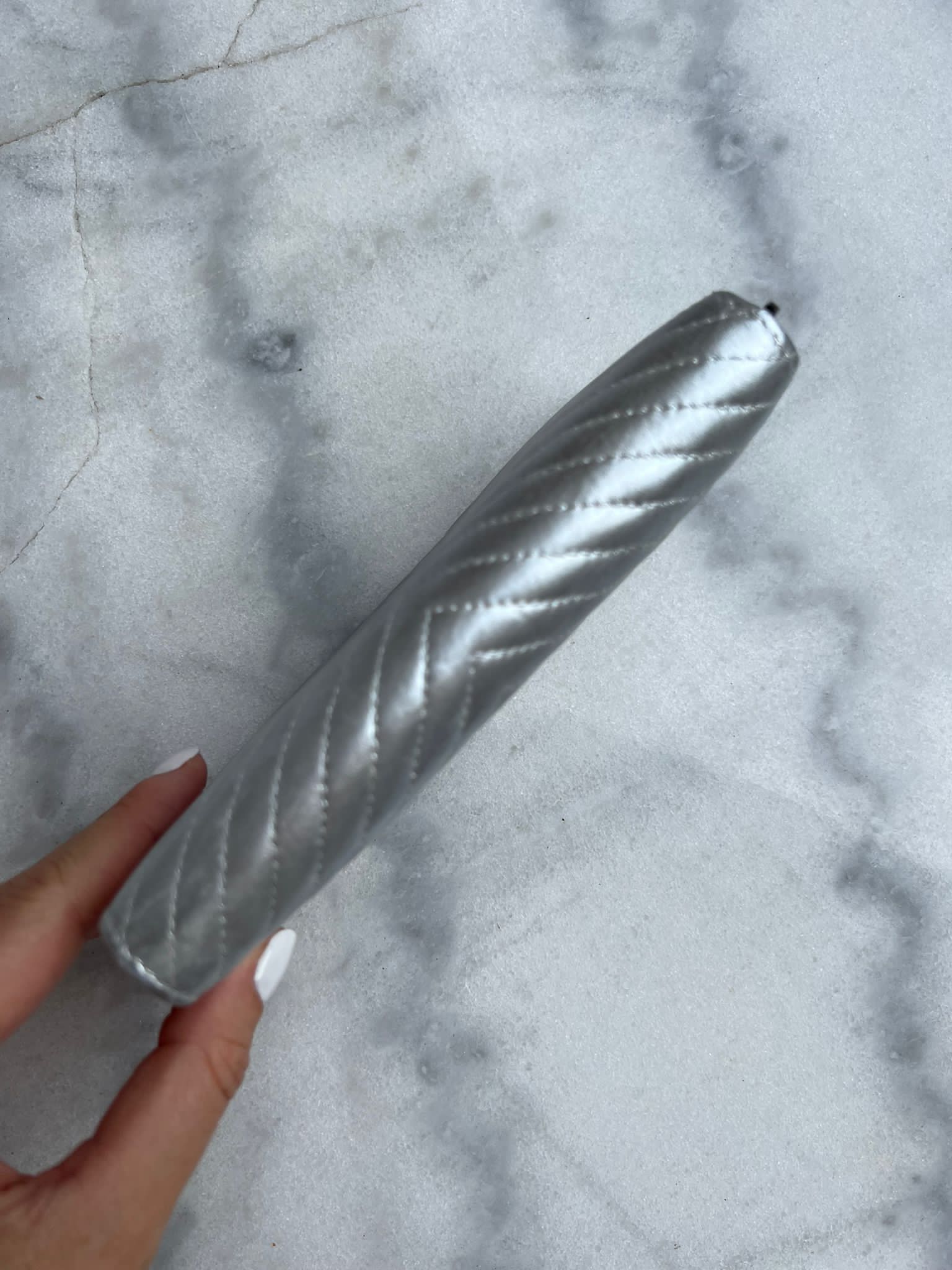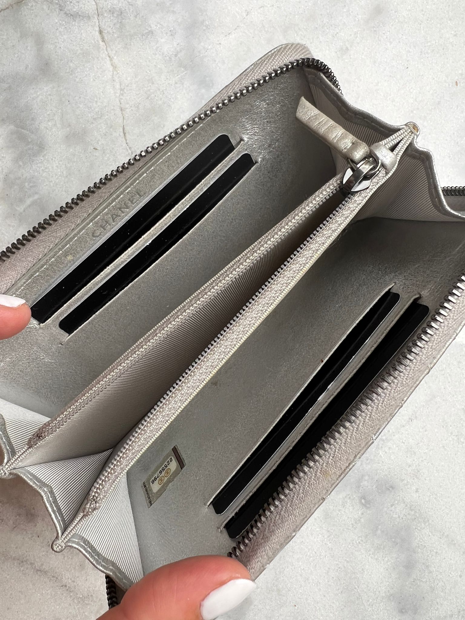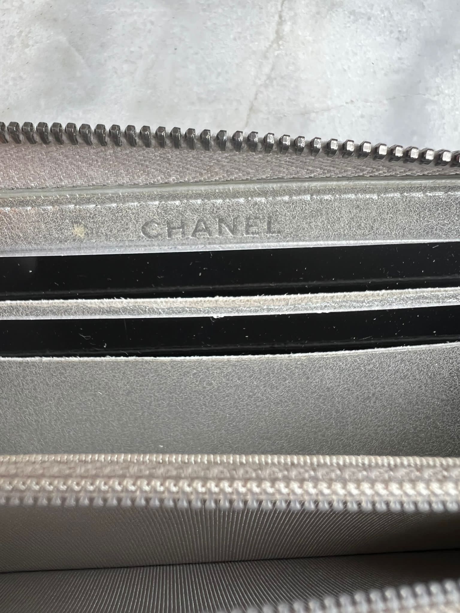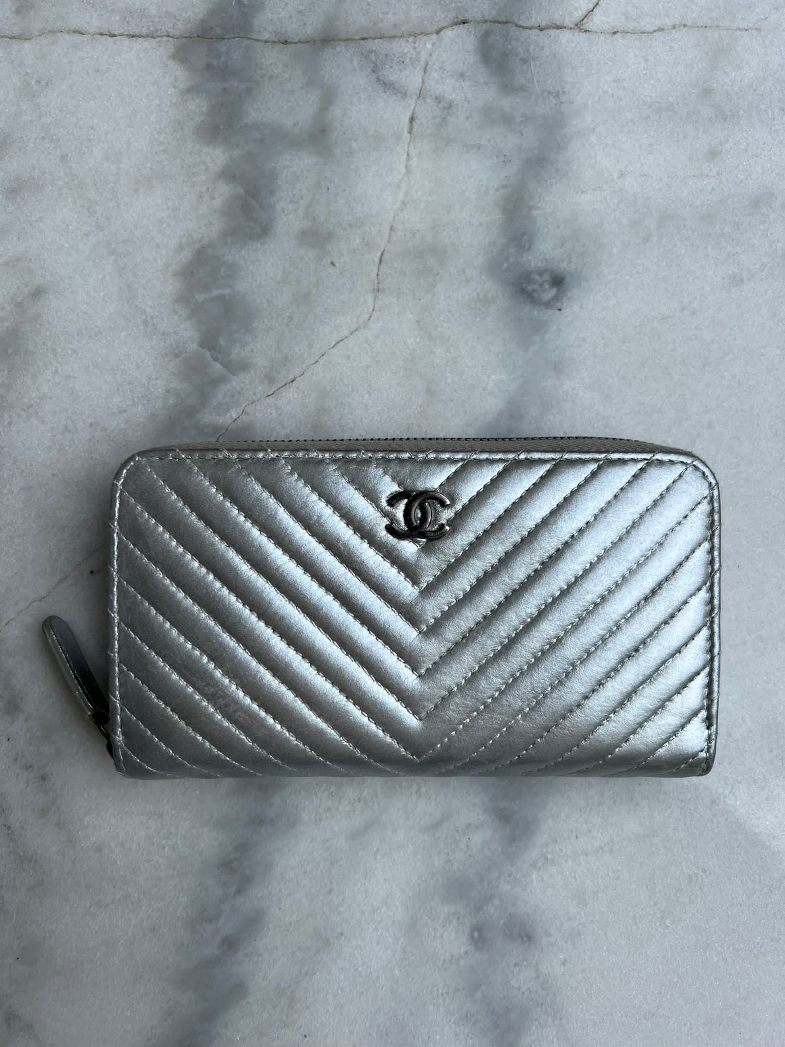 Beautiful Chanel chevron wallet in silver leather. The wallet has been to the spa for a color touch up. The code is inside and readable and it comes with the authenticity card. It was made in 2016. Some small signs of wear but overall in good condition. 15 cm wide 8,5 cm high