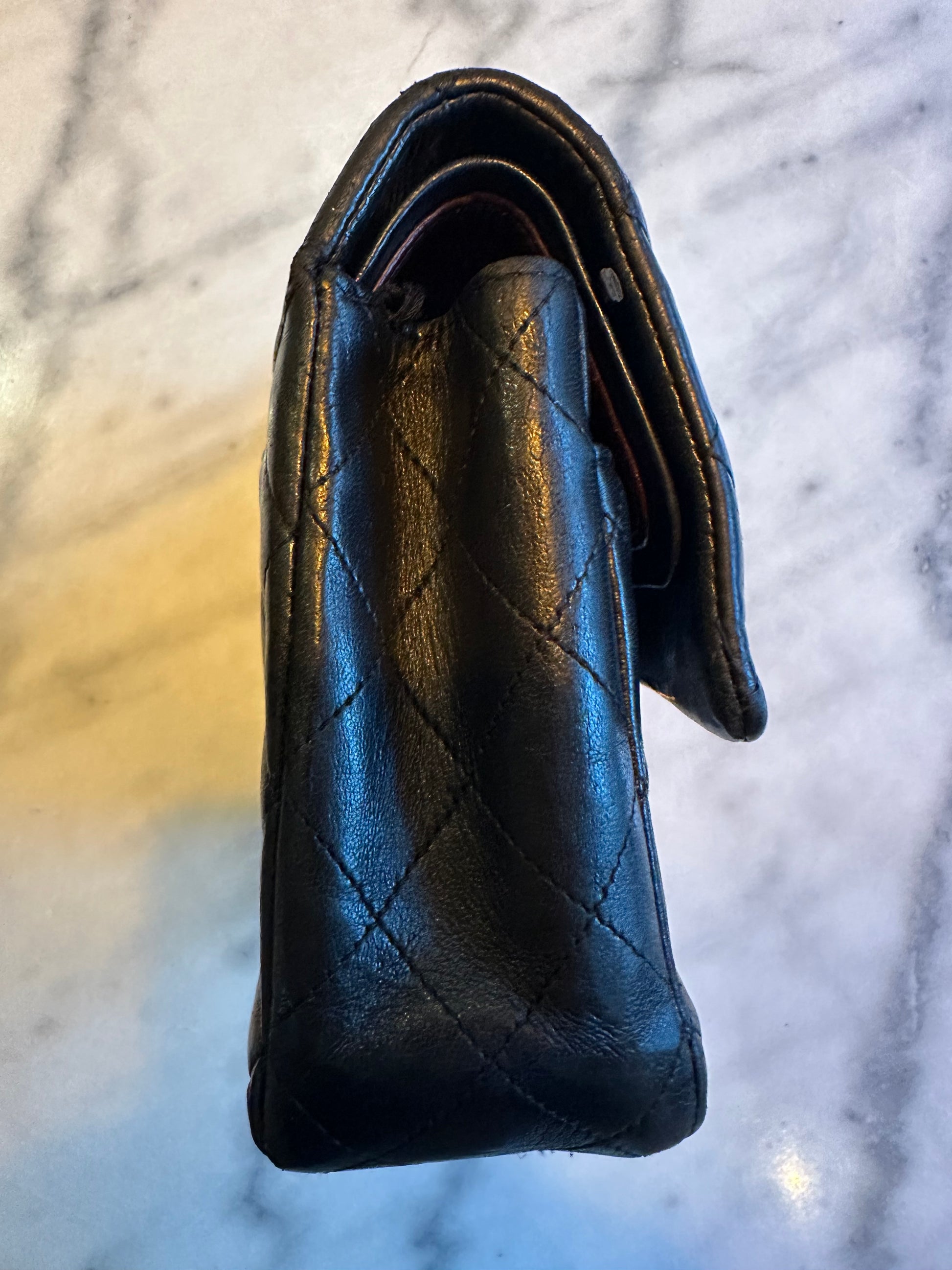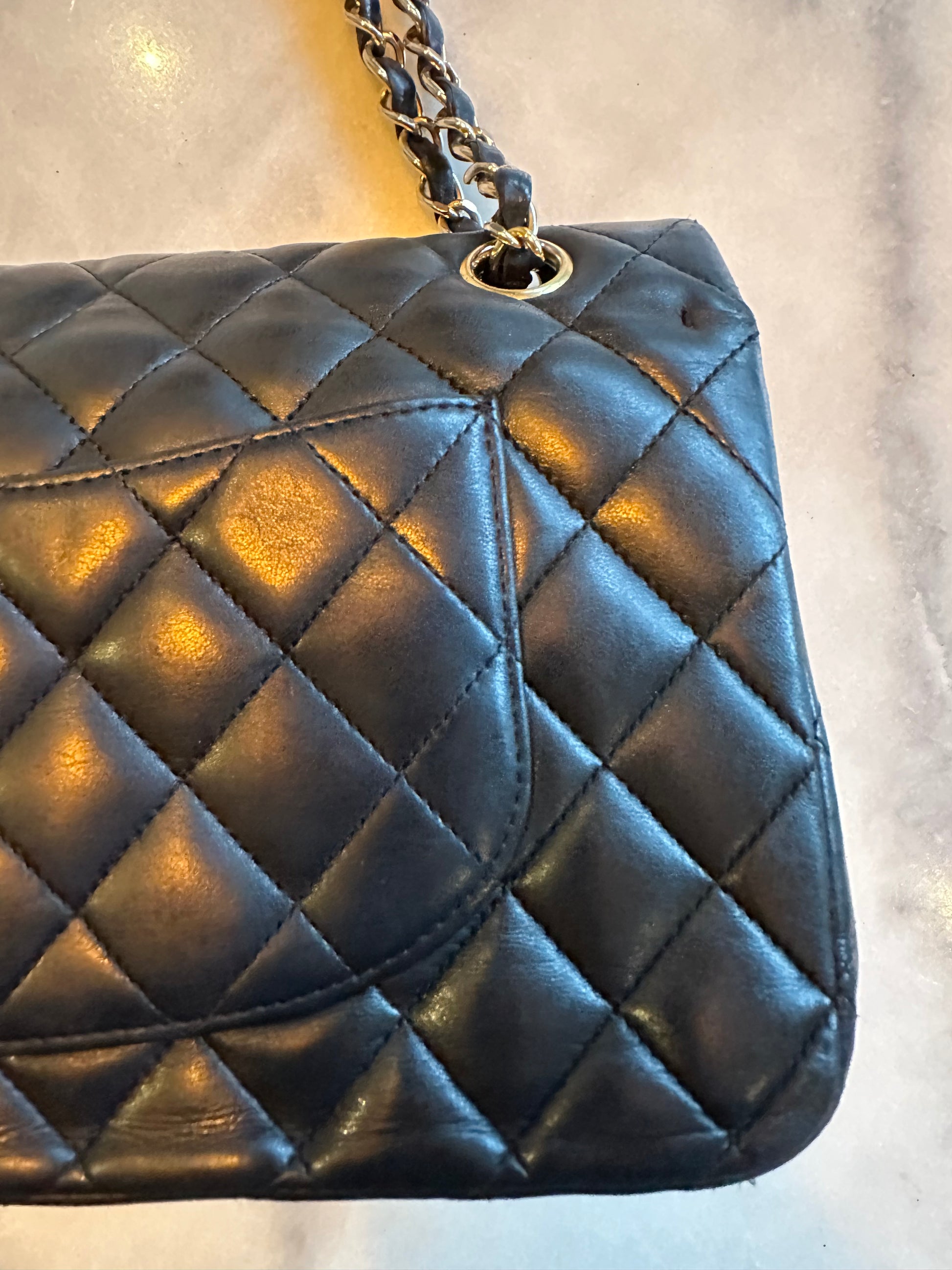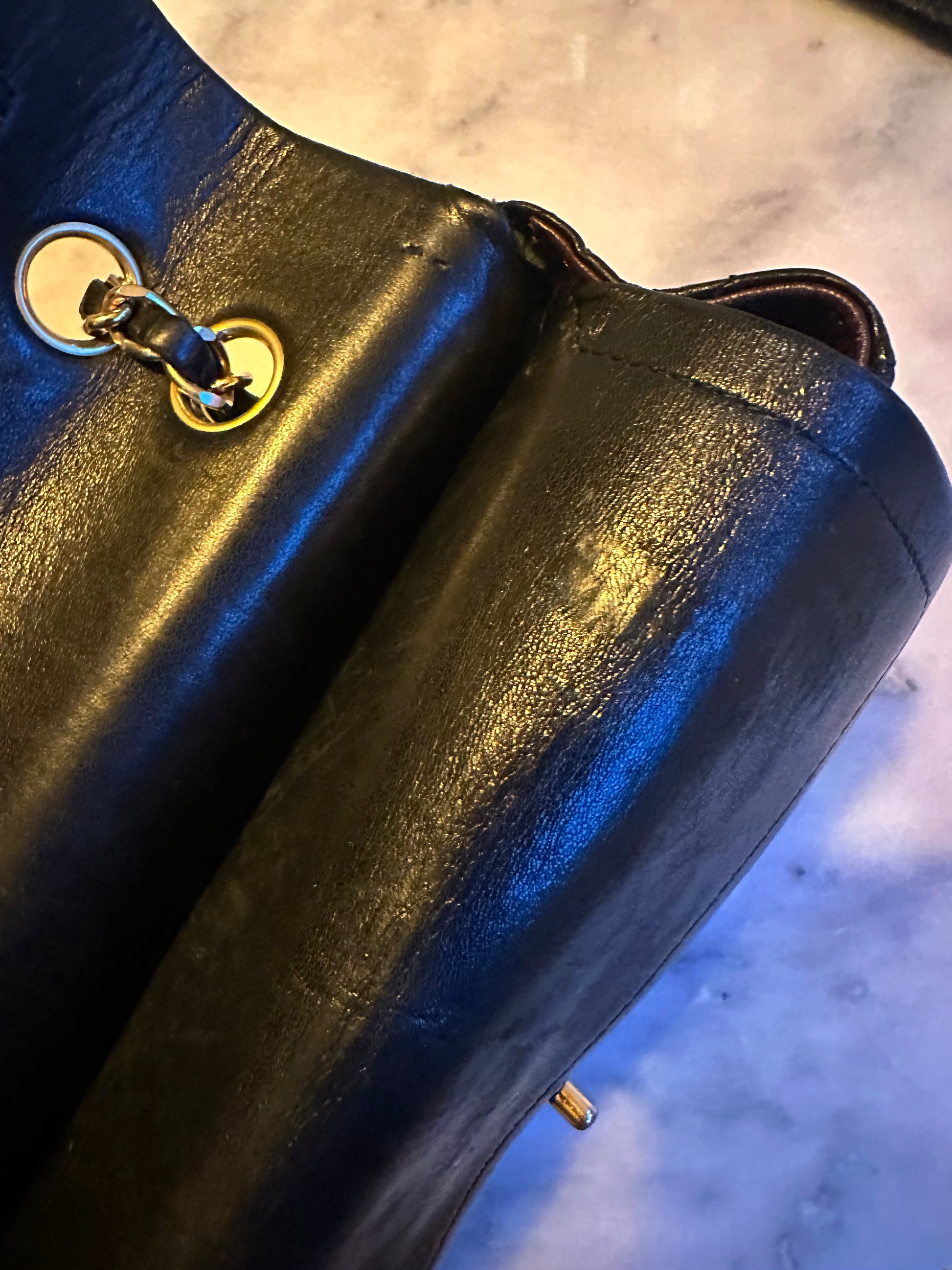 Beautiful vintage Chanel medium Classic double flap bag in black leather with gold hardware. There are some signs of wear to the leather and the hardware. Some small wear to the corners and the leather. Two stitches are loose but it doesn’t cause any problems and it can be repaired.The code is inside and readable. It comes without the authenticity, box and the dustbag. Can be worn on the shoulder and as a high crossbody bag. The hardware is gold plated. A true vintage beauty.