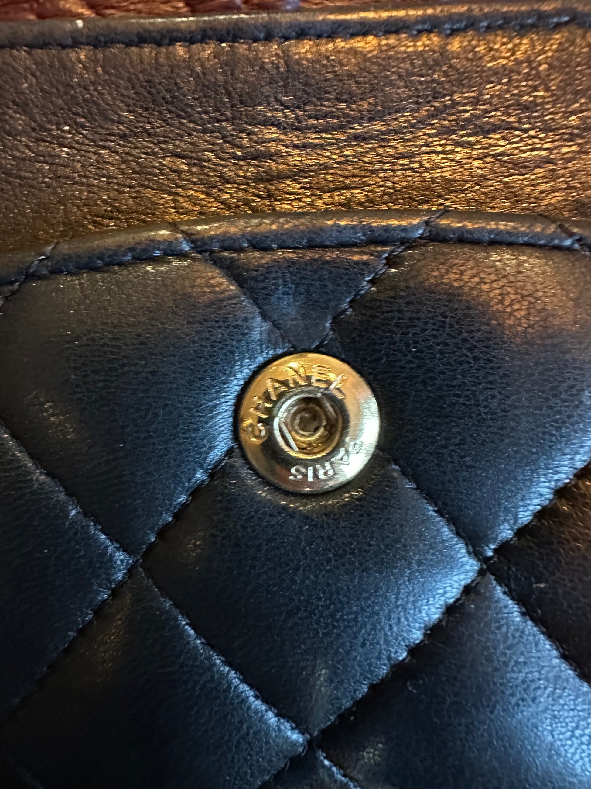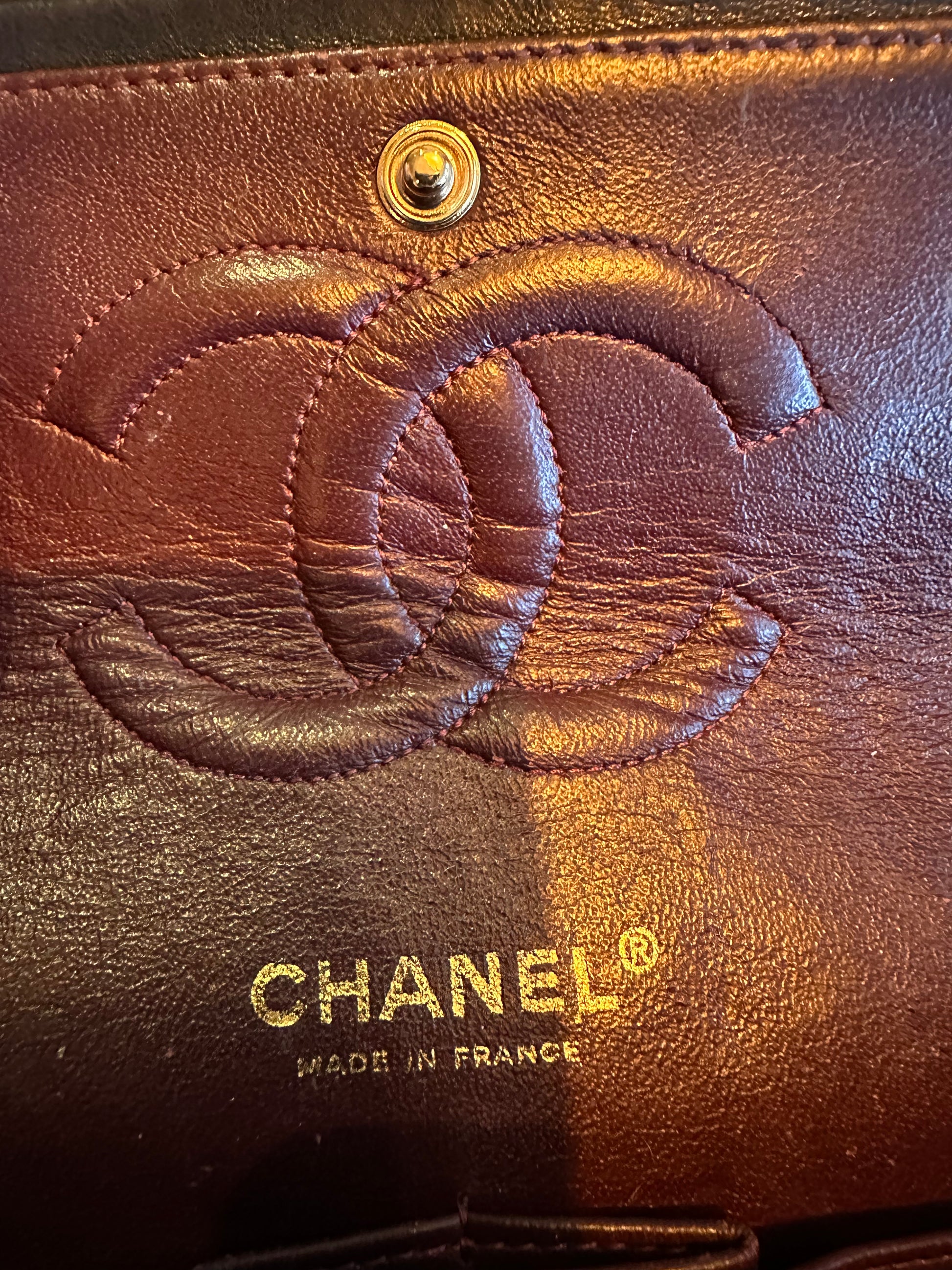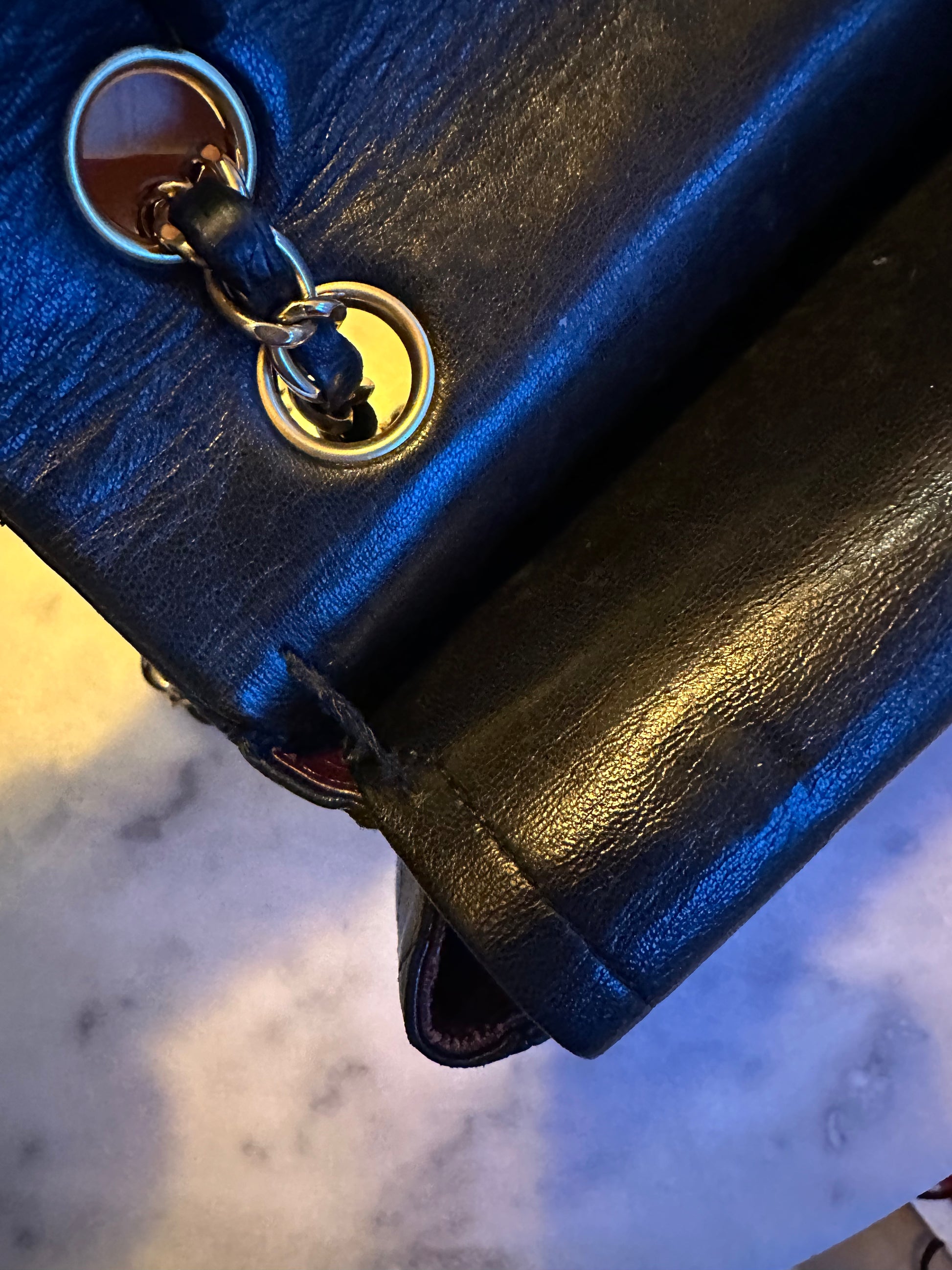 Beautiful vintage Chanel medium Classic double flap bag in black leather with gold hardware. There are some signs of wear to the leather and the hardware. Some small wear to the corners and the leather. Two stitches are loose but it doesn’t cause any problems and it can be repaired.The code is inside and readable. It comes without the authenticity, box and the dustbag. Can be worn on the shoulder and as a high crossbody bag. The hardware is gold plated. A true vintage beauty.