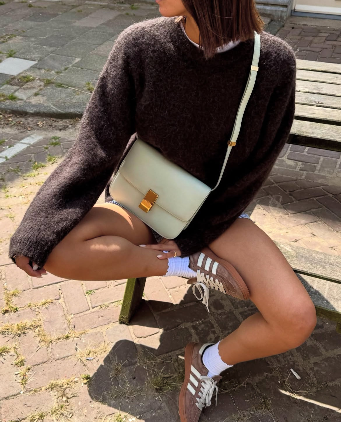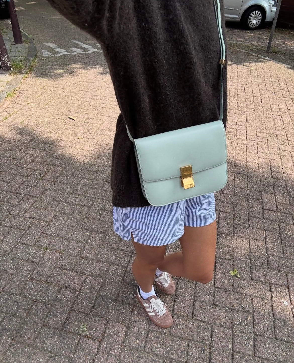 Amazing Celine classic box bag in light green leather. Some signs of wear. Some small scratches as shown on the pictures. Some wear to the gold hardware. This color is not available in stores right now. The retail price for a medium classic box is €3300. Comes with the dustbag. Can be worn on the shoulder and crossbody the strap is adjustable.