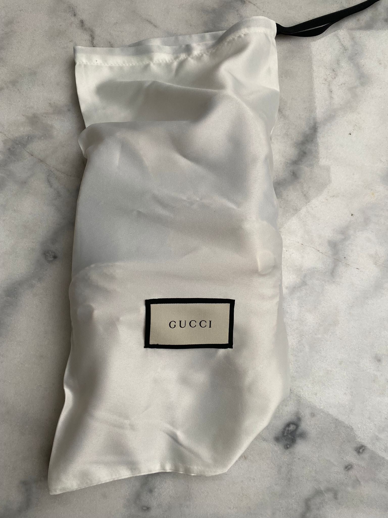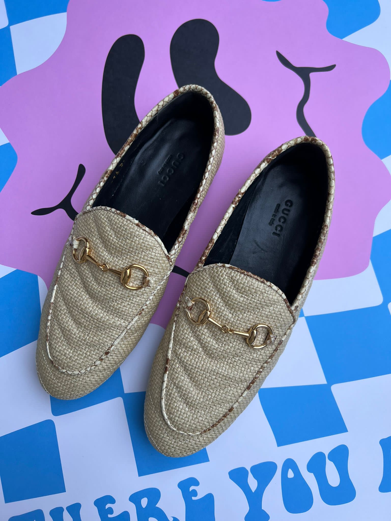Beautiful Gucci Jordaan flats in beige cloth and leather. They have been worn a couple of times but are still in good condition. The length of the sole is 25,4 cm measured on the outside. Comes with a Gucci box and a Gucci dustbag.