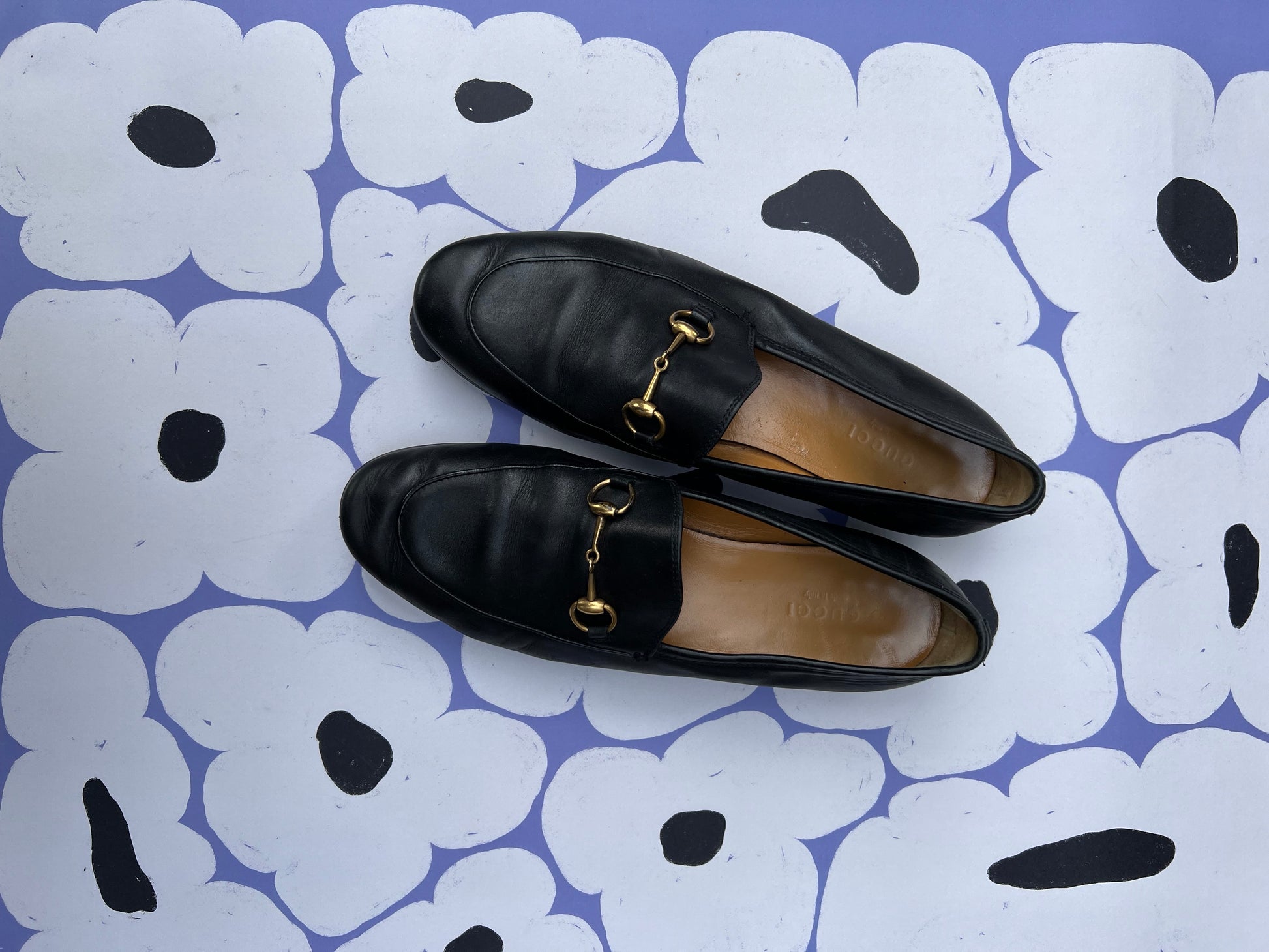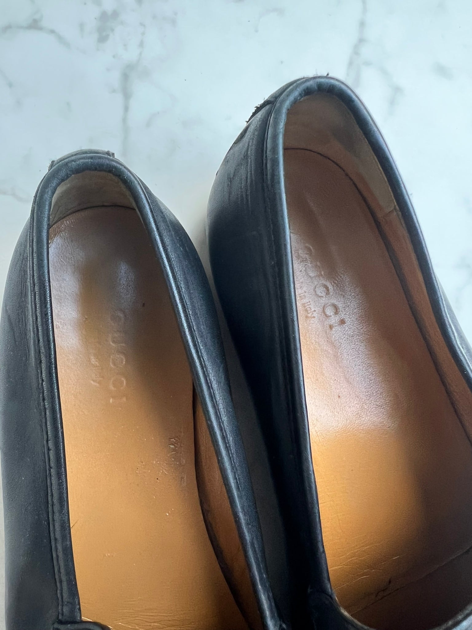 Beautiful Gucci Jordaan flats in black leather. They have been worn a couple of times but are still in good condition. A protective sole has been added because leather soles are slippery and wear out fast. Some small signs of wear. The length of the sole is 26,5cm measured on the outside. Comes without a Gucci box and dustbag.