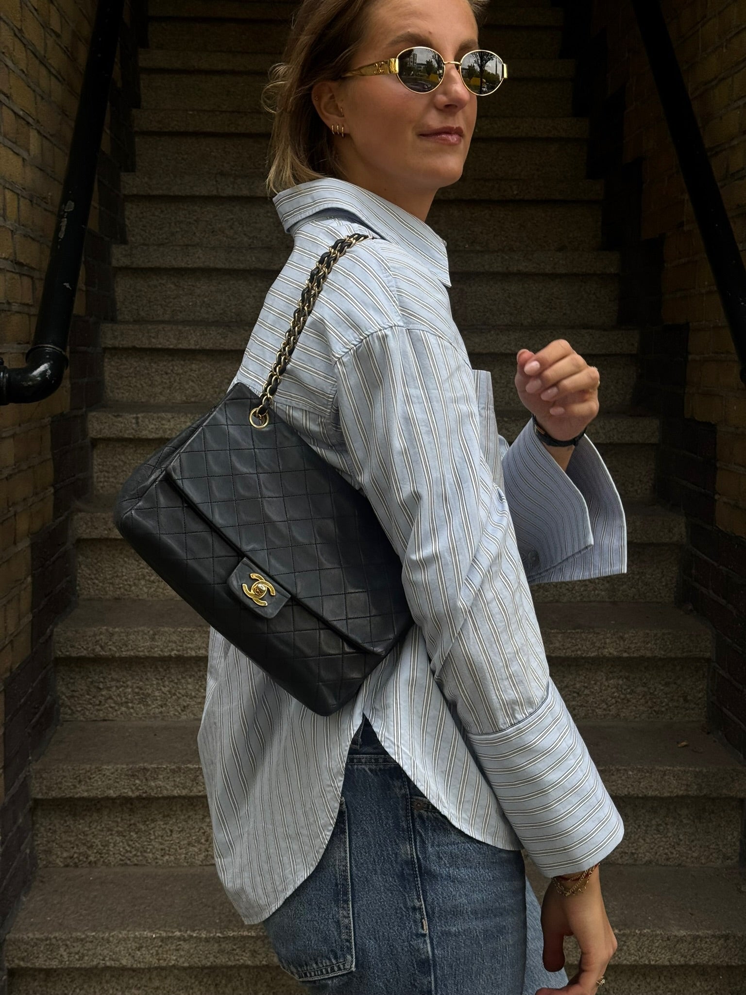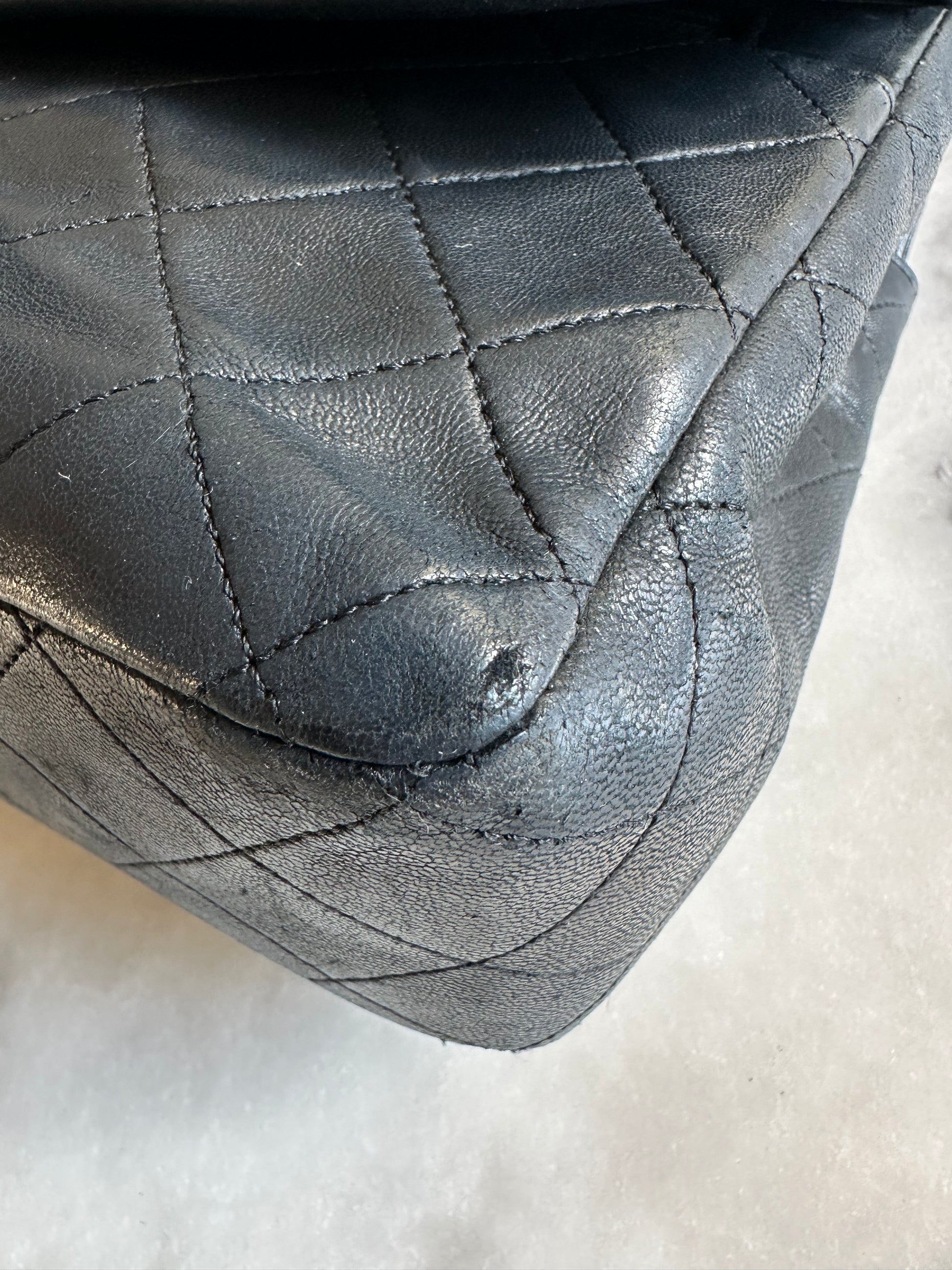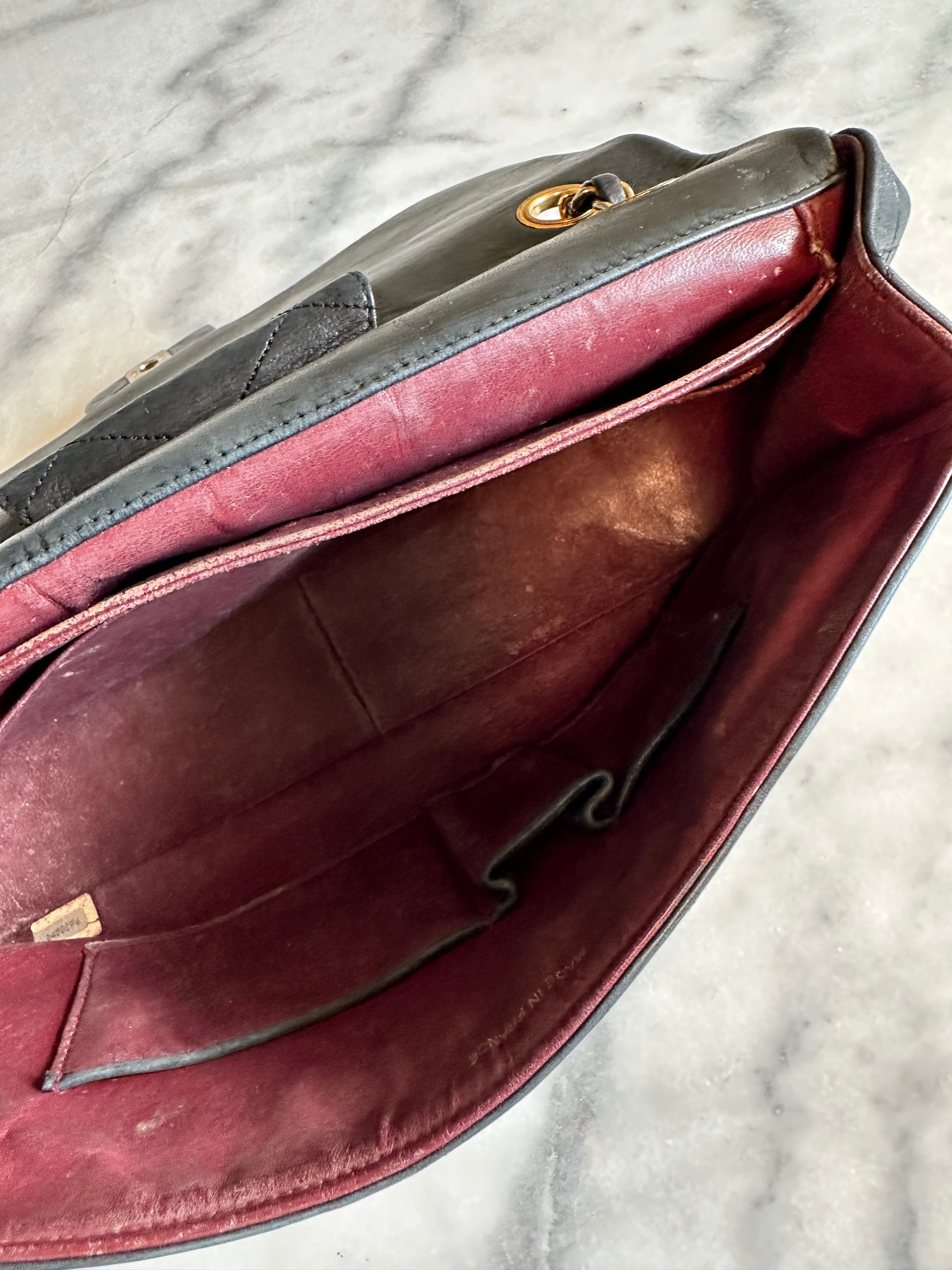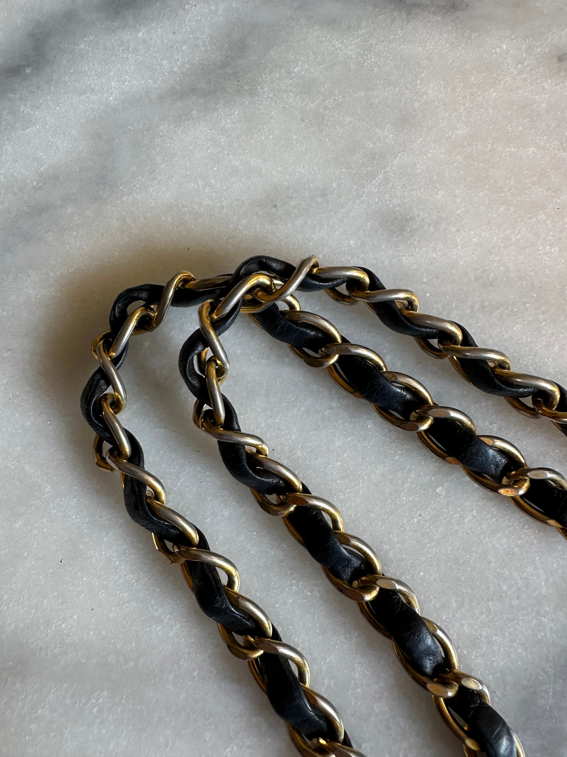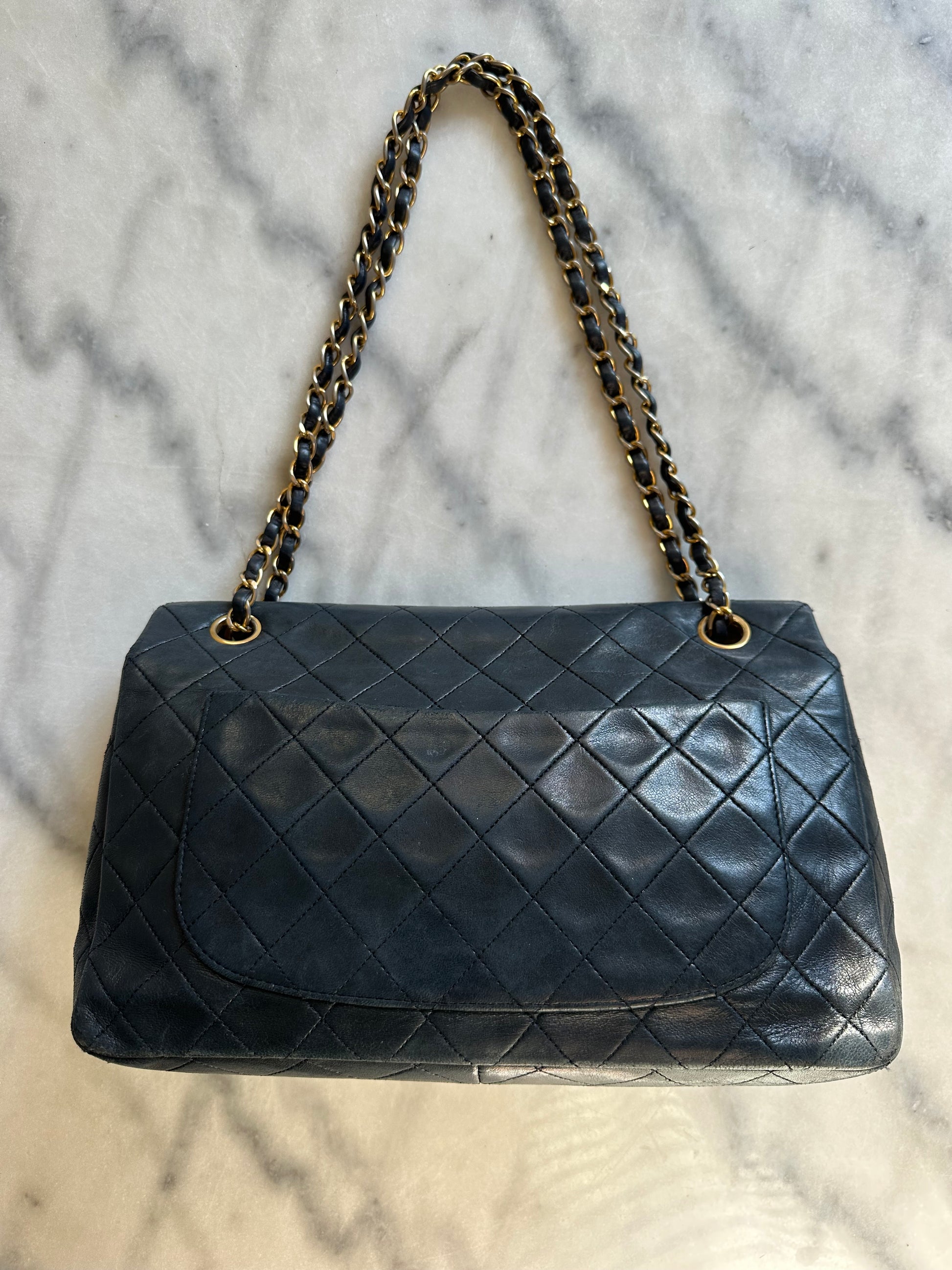Beautiful vintage Chanel medium Classic double flap bag in black or dark blue leather with gold hardware. There are some signs of wear to the leather and the hardware. Some wear to the corners and the leather. The code is inside and readable. It comes without the authenticity, box and the dustbag. Can be worn on the shoulder and as a high crossbody bag. The hardware is gold plated. A true vintage beauty.