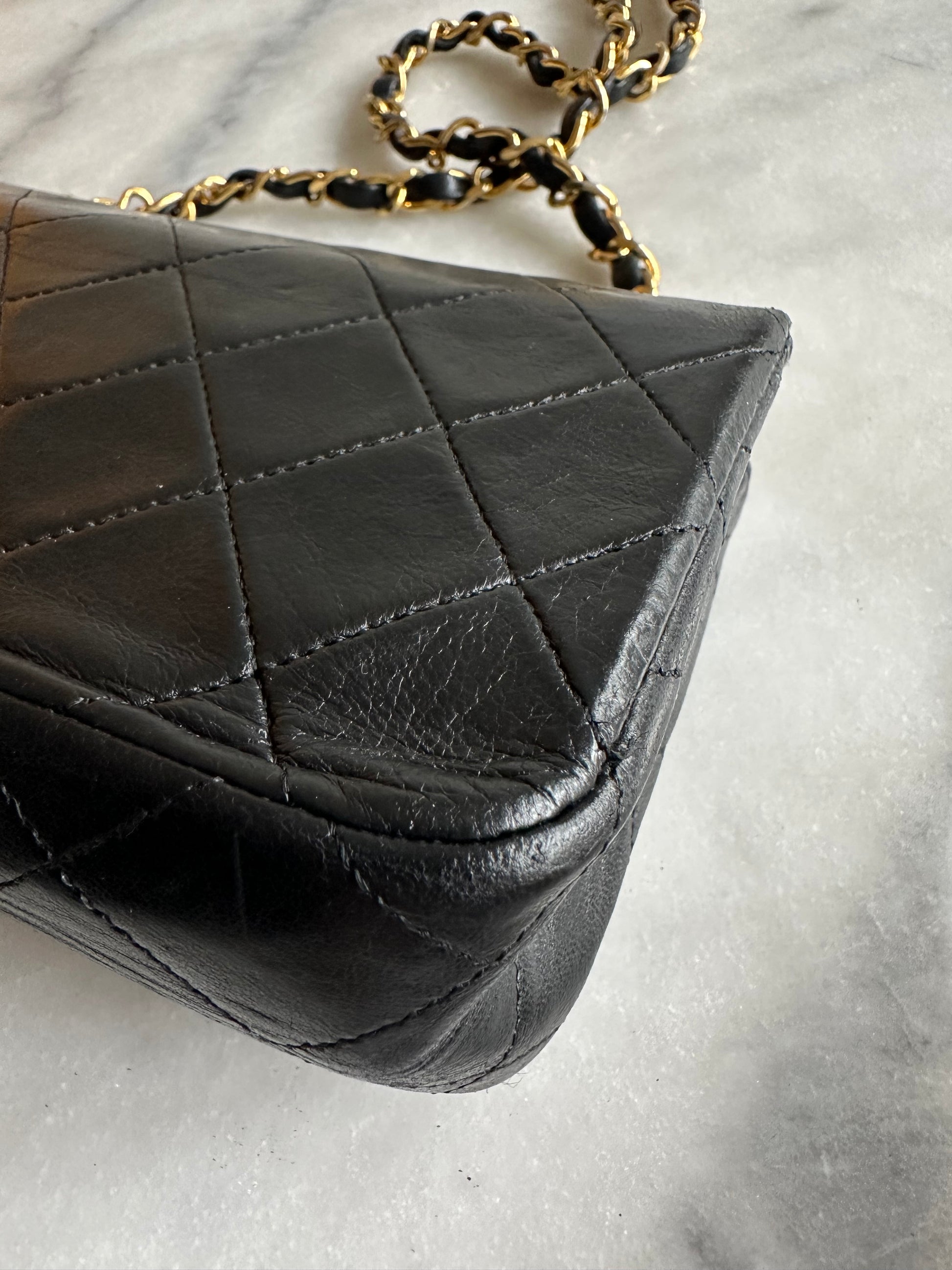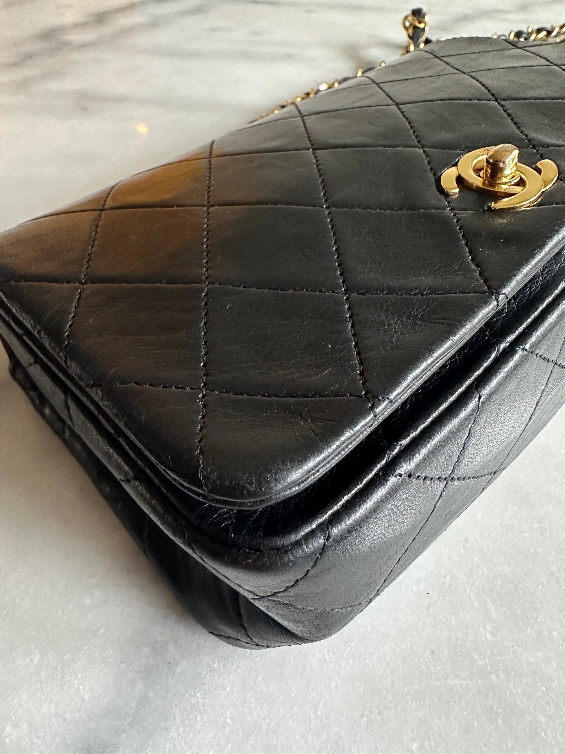 Beautiful vintage Chanel Classic single flap bag in black leather with gold hardware. There are some signs of wear to the leather mainly to the corners. The code is inside and readable. It does not come with the authenticity card. The bag has been to the bag spa for a color touch up in the original color. Can be worn on the shoulder and crossbody. The hardware of the chain is gold plated. A true vintage beauty.