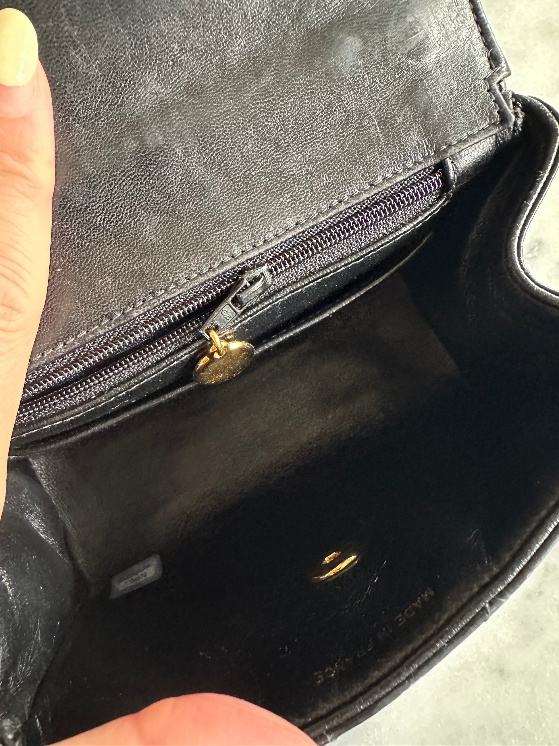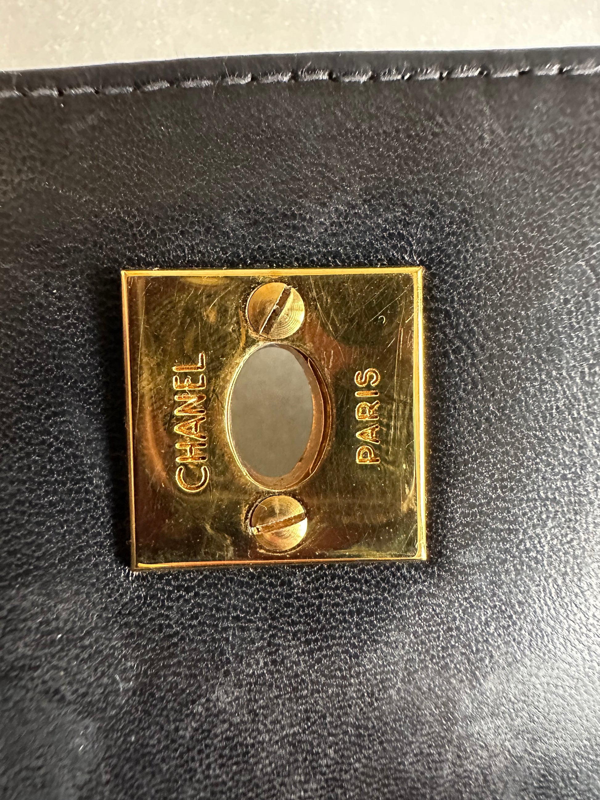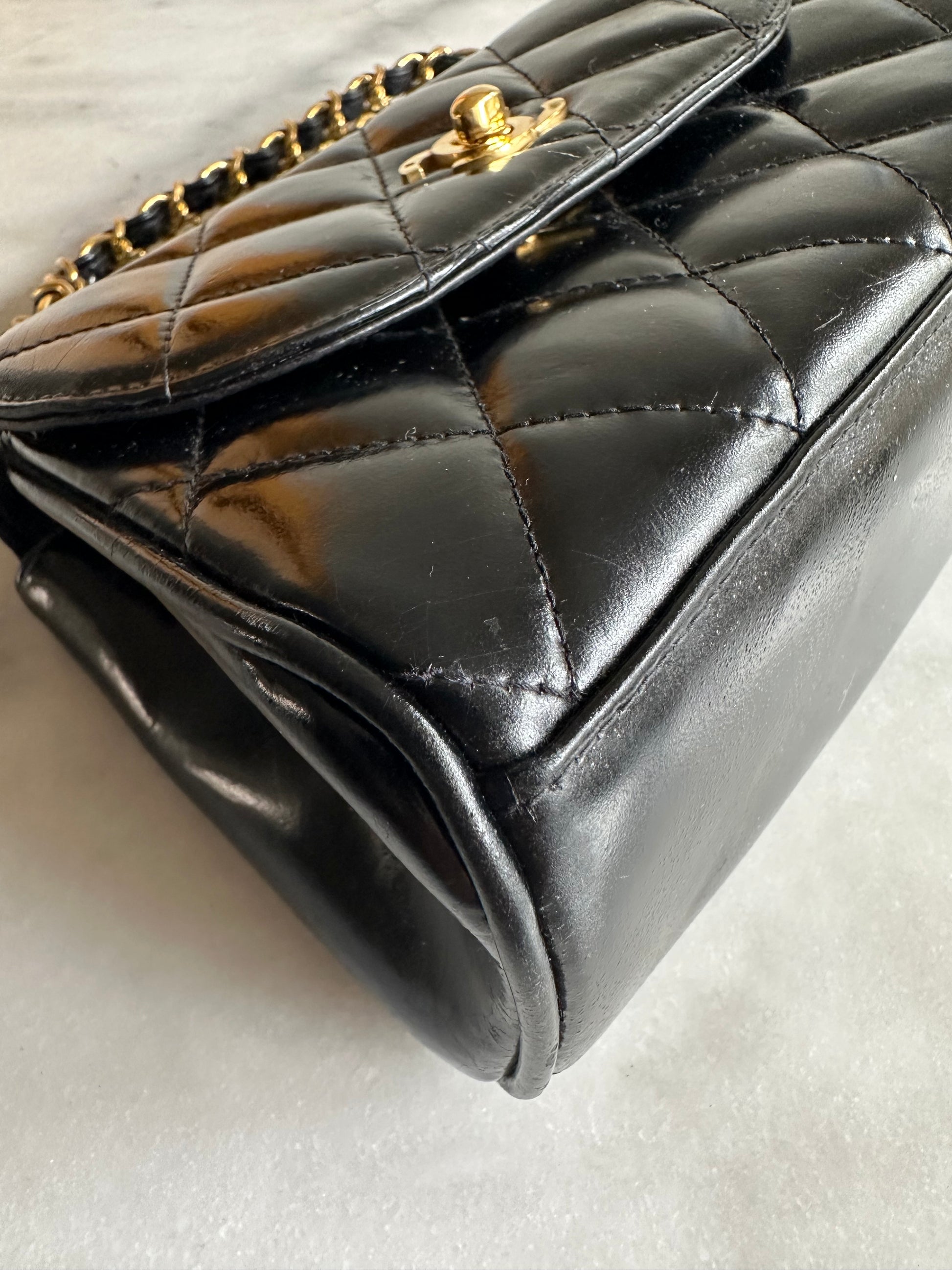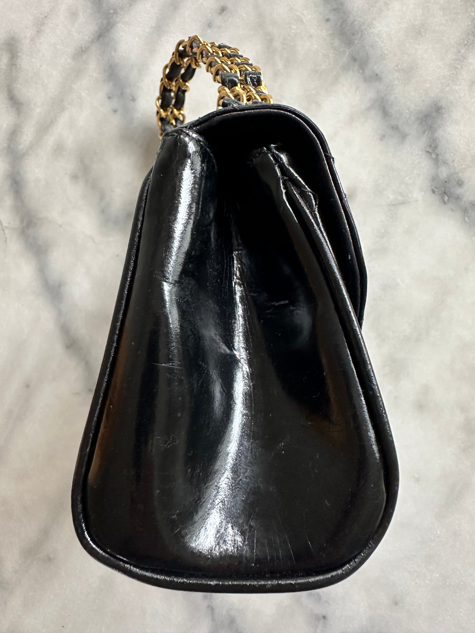 Beautiful vintage Chanel mini Kelly square bag in black patent leather. The bag has some wear to the leather and the hardware. The gold plated hardware is in good condition. Overall still a very beautiful bag. The code is inside and readable. Comes with the authenticity card dustbag and box.