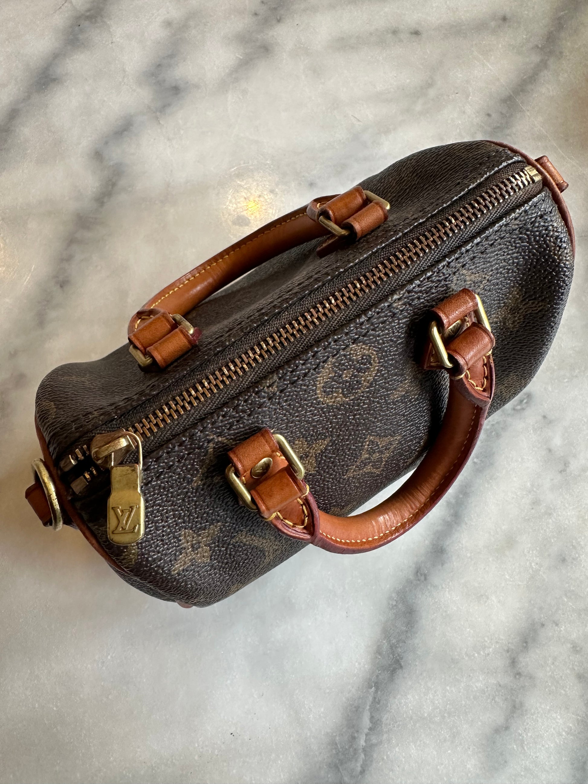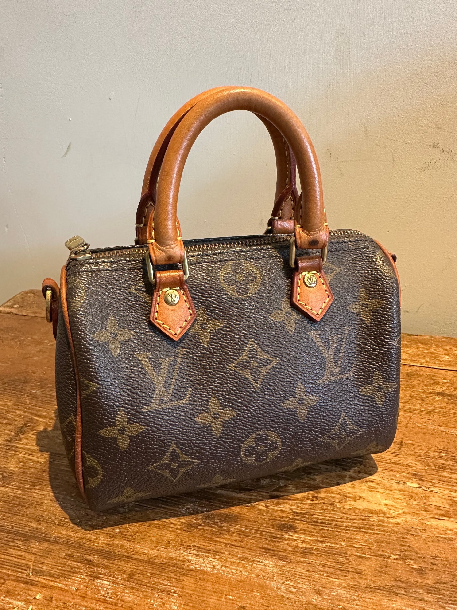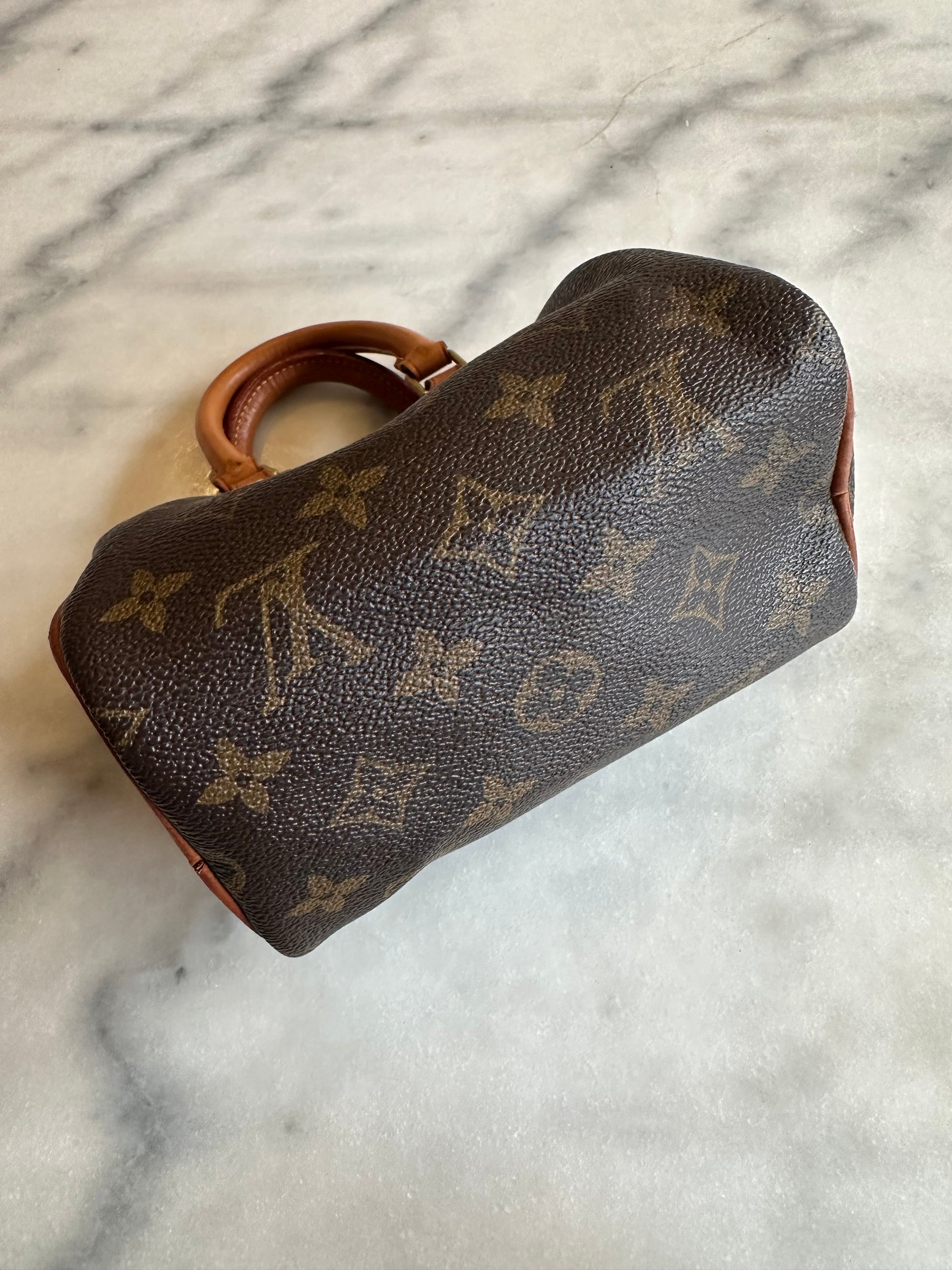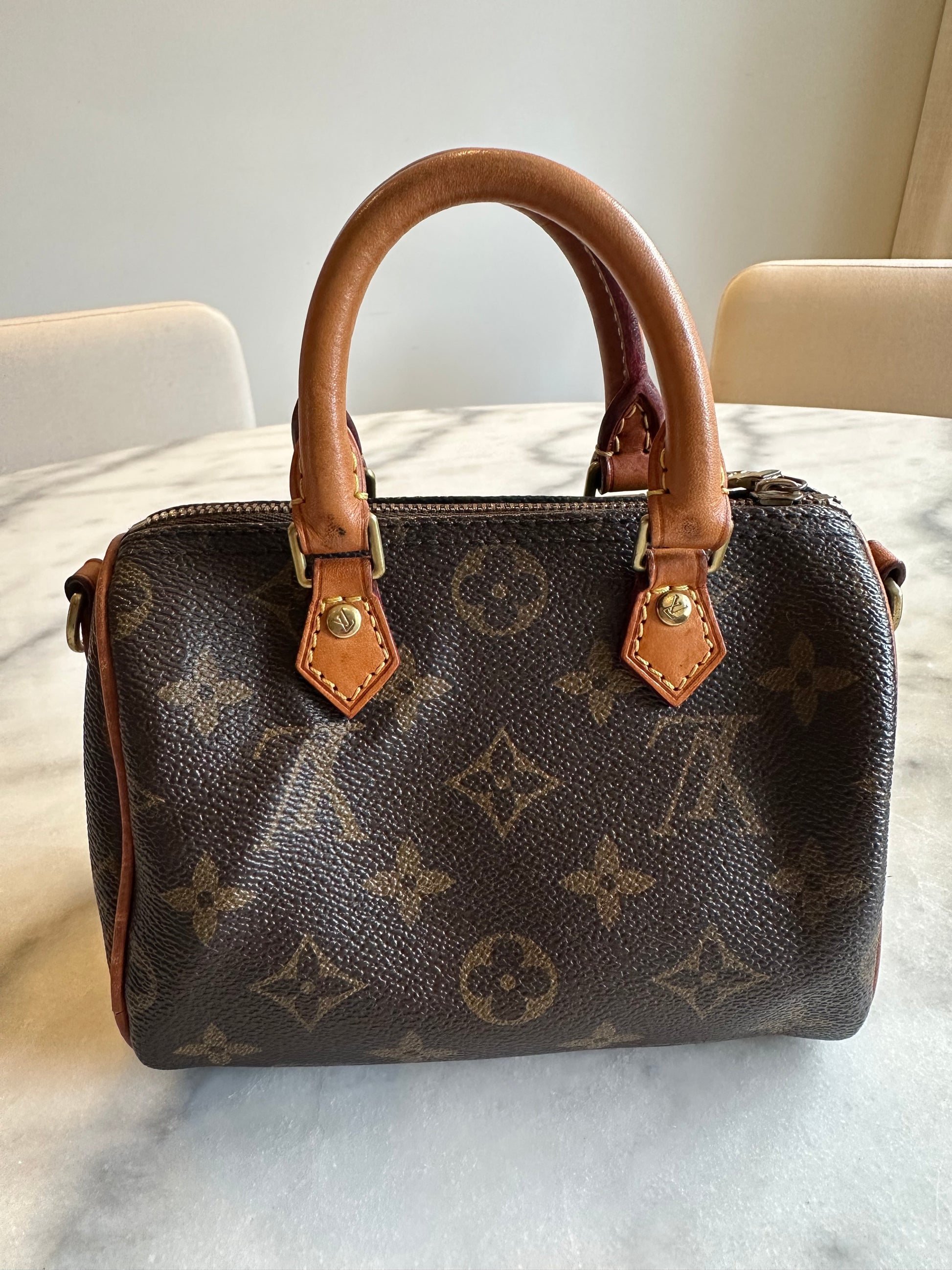 Beautiful Louis Vuitton nano speedy in brown canvas and leather. The bag is made in spain in 2015 and the code of the bag is CA4125. So a true vintage beauty. The bag has some marks on the handles as seen on the pictures. Inside of the bag is clean and has no marks. A shoulder strap can be added but is not included. Comes without a dustbag box and receipt.