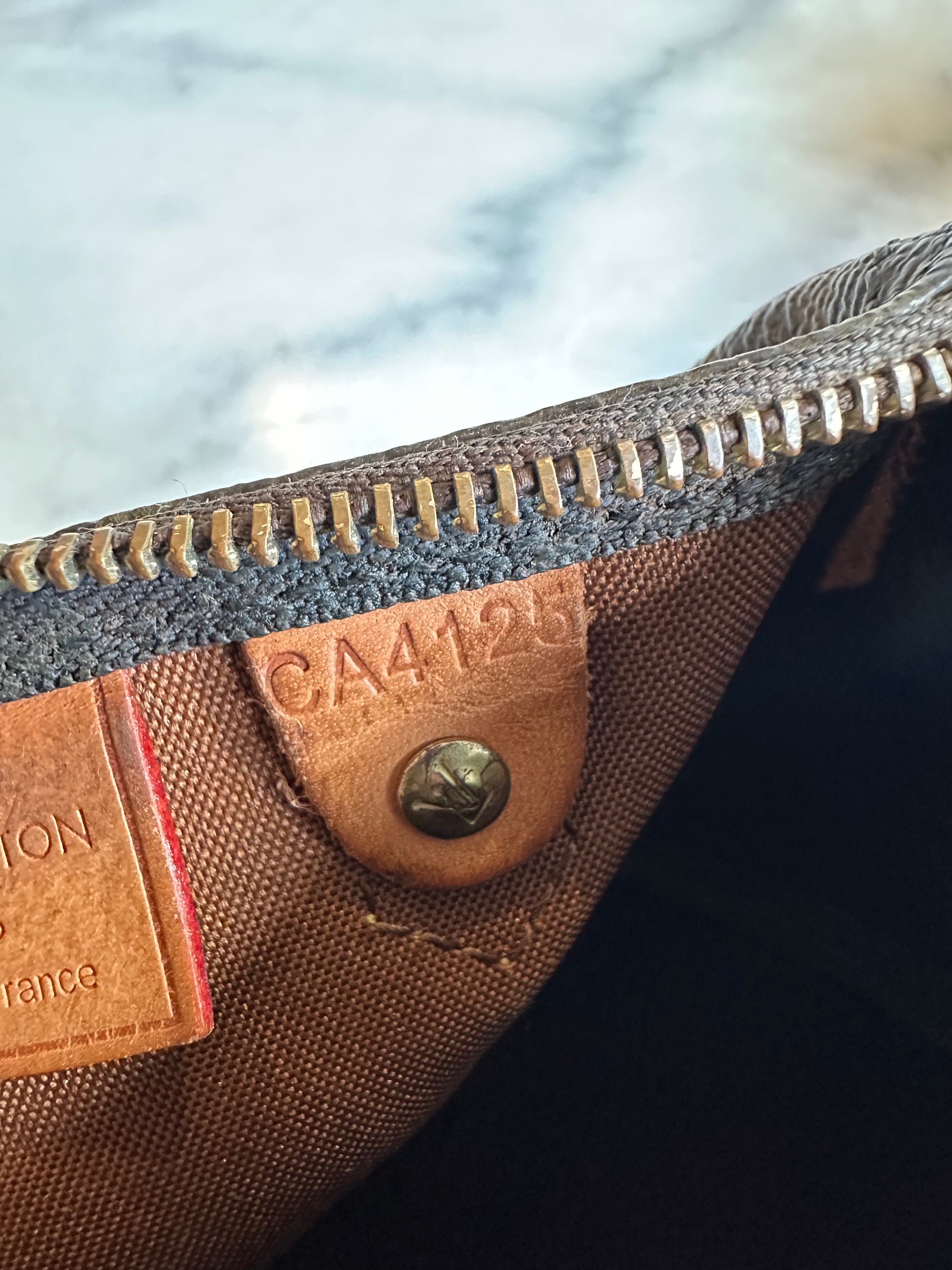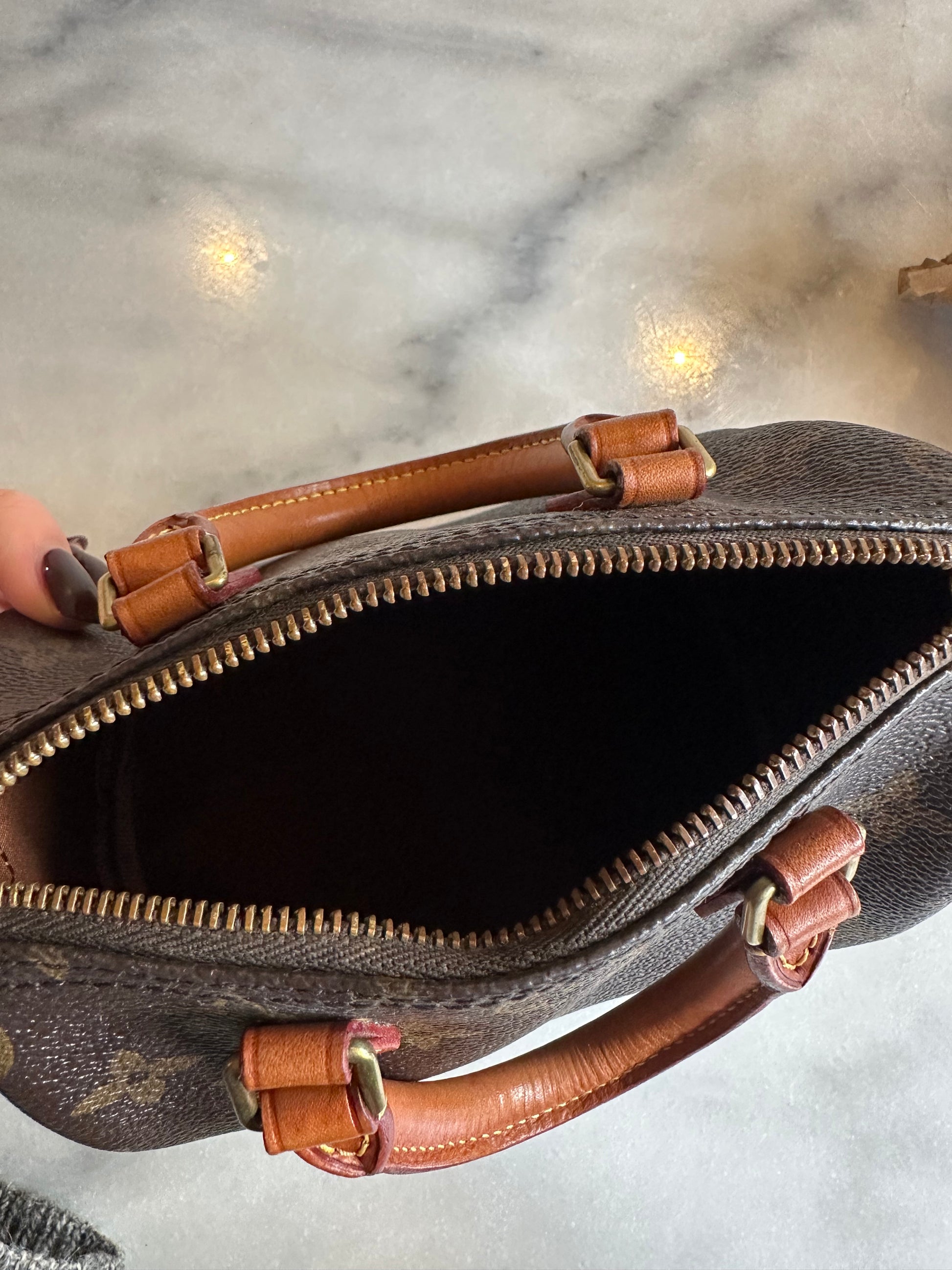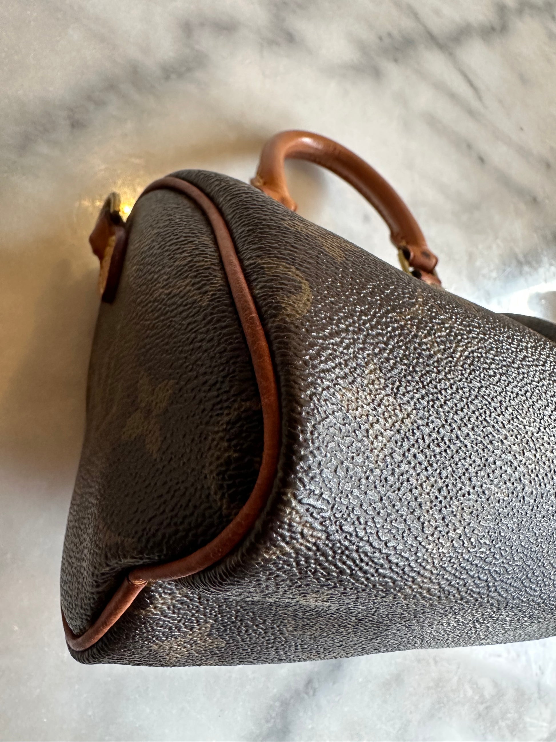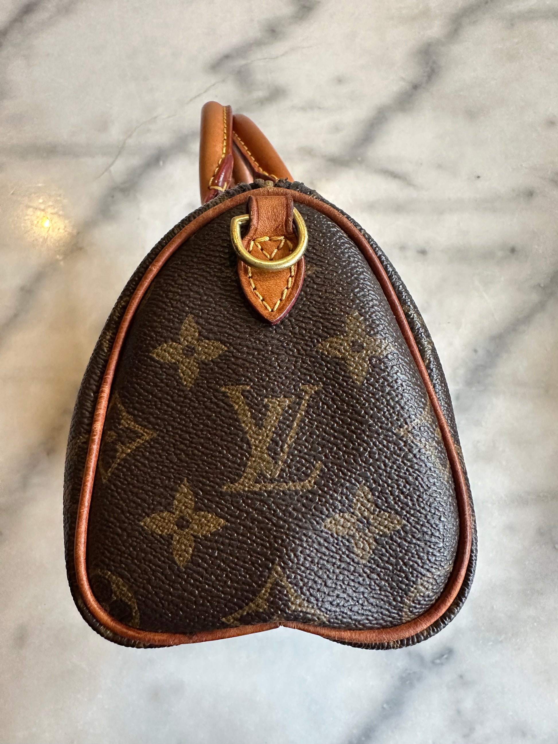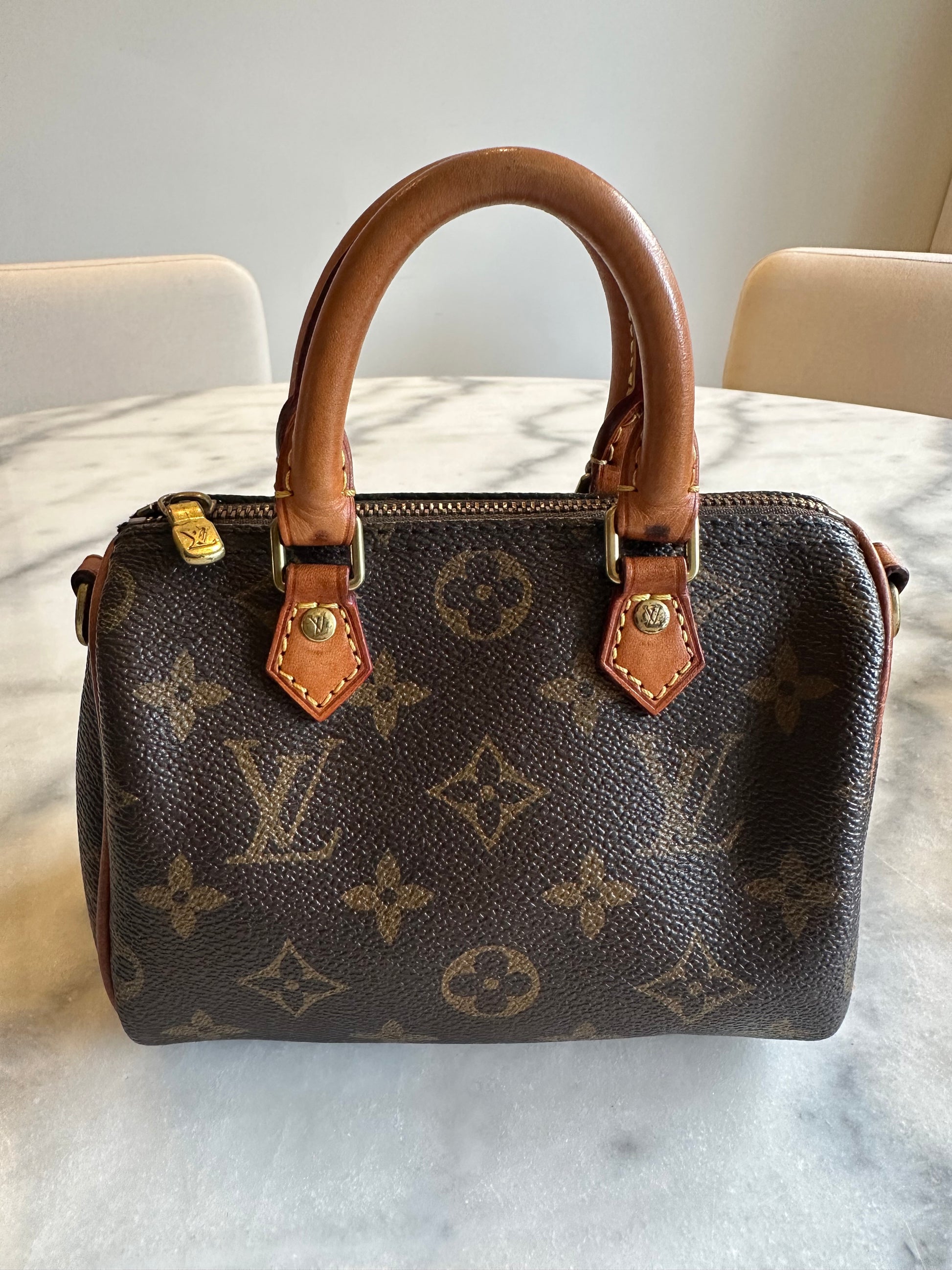Beautiful Louis Vuitton nano speedy in brown canvas and leather. The bag is made in spain in 2015 and the code of the bag is CA4125. So a true vintage beauty. The bag has some marks on the handles as seen on the pictures. Inside of the bag is clean and has no marks. A shoulder strap can be added but is not included. Comes without a dustbag box and receipt.