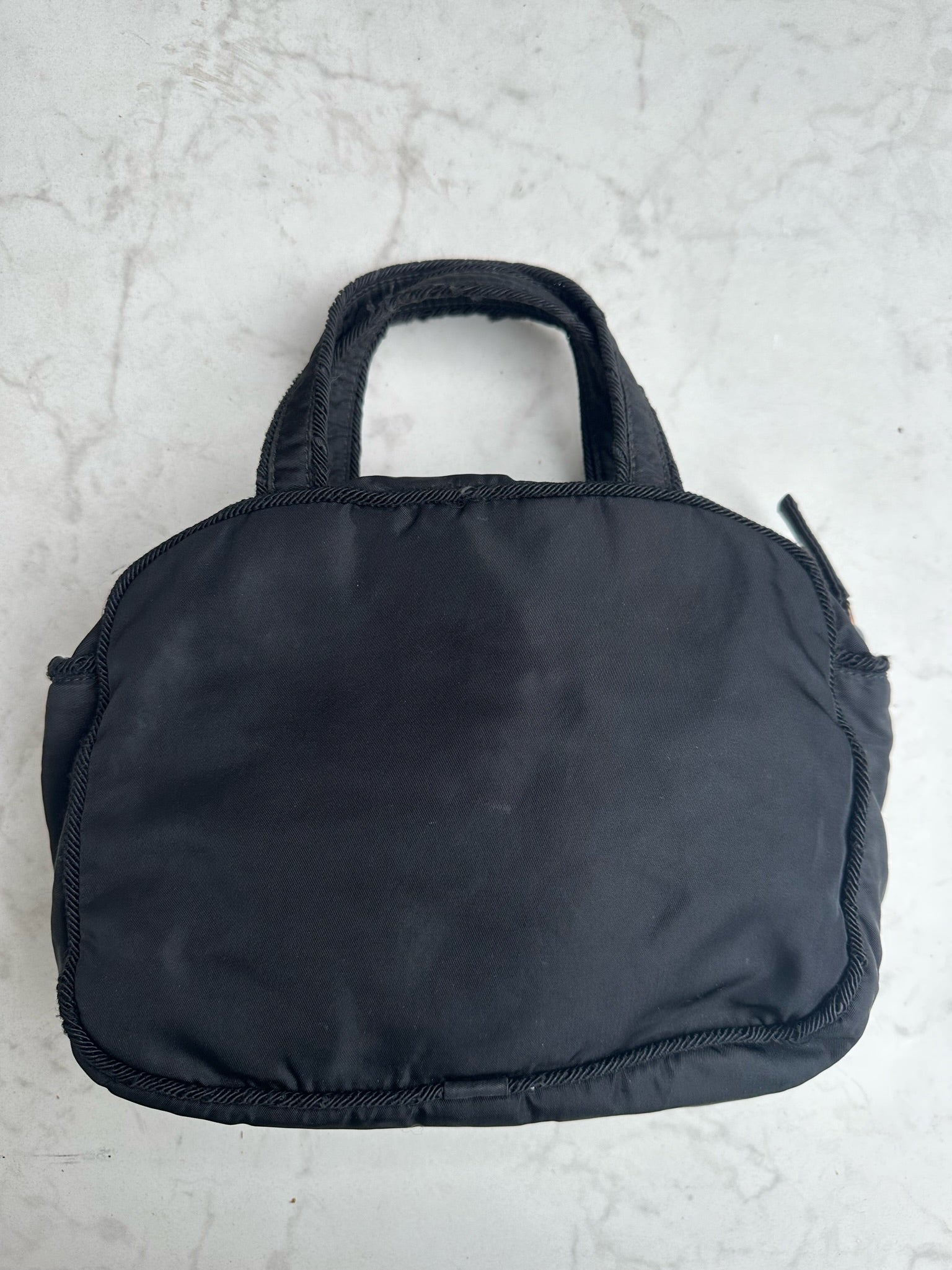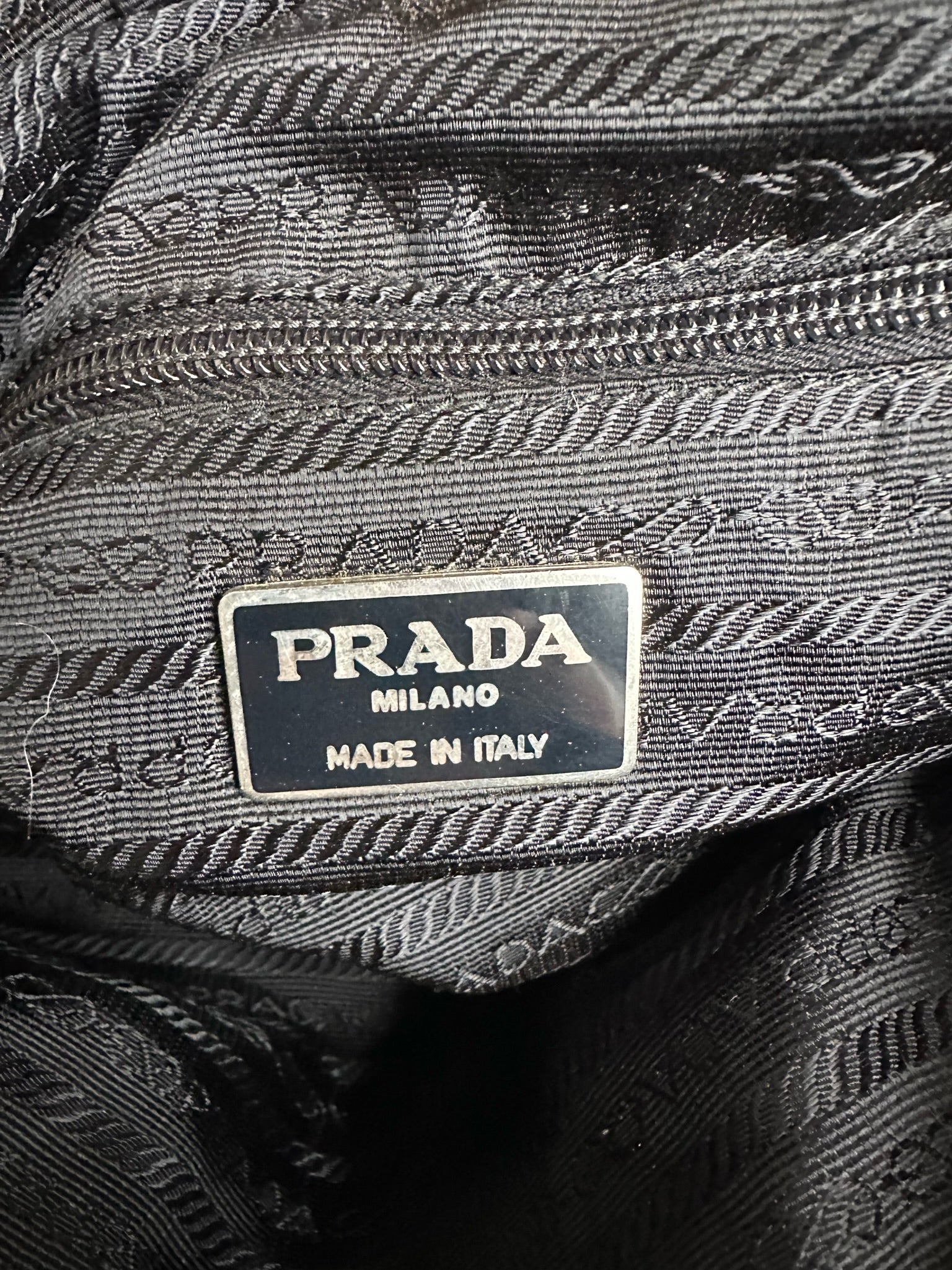 Beautiful vintage Prada bag in black canvas with black glitter logo. The bag has some signs of wear to the canvas. Some wear to the handles and on the inside. Overall still in good condition. Comes without dustbag. 24 cm wide 17 cm high