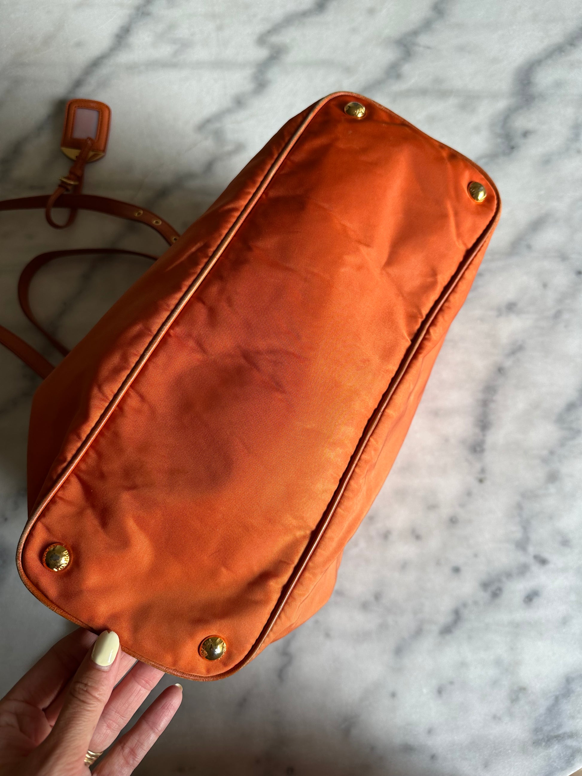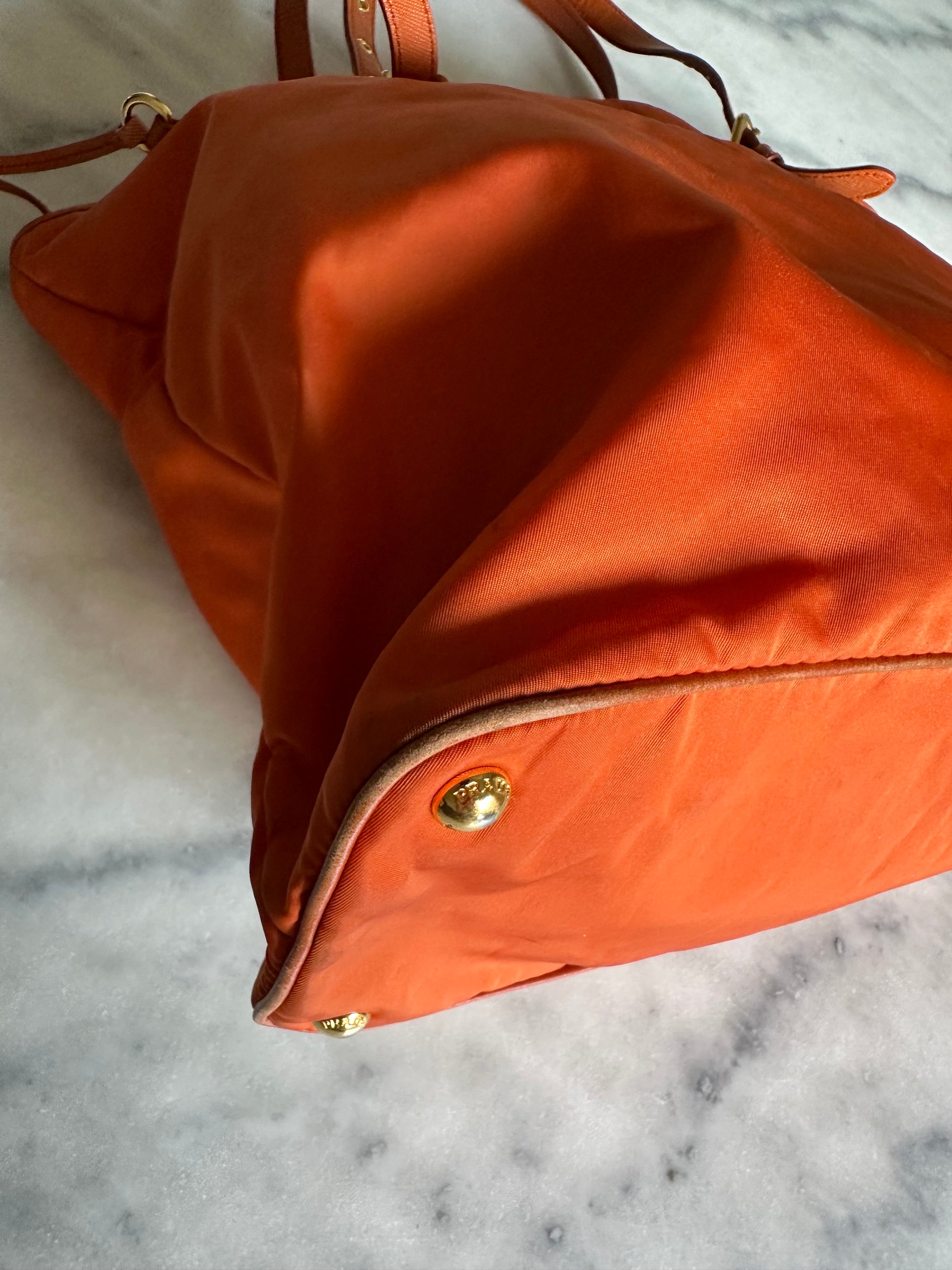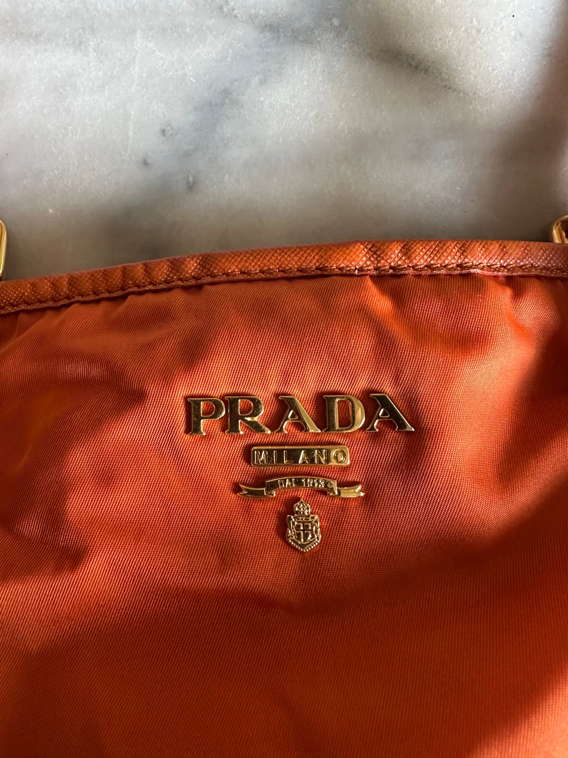 Beautiful vintage Prada shopper bag in orange nylon and leather. The bag has some wear to the corners of the bag as seen on the pictures. The three Inside pockets are clean. It comes with the attached Prada name tag. Comes without dustbag.