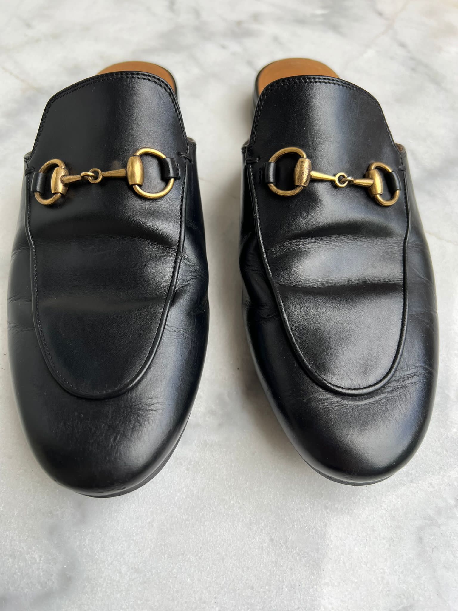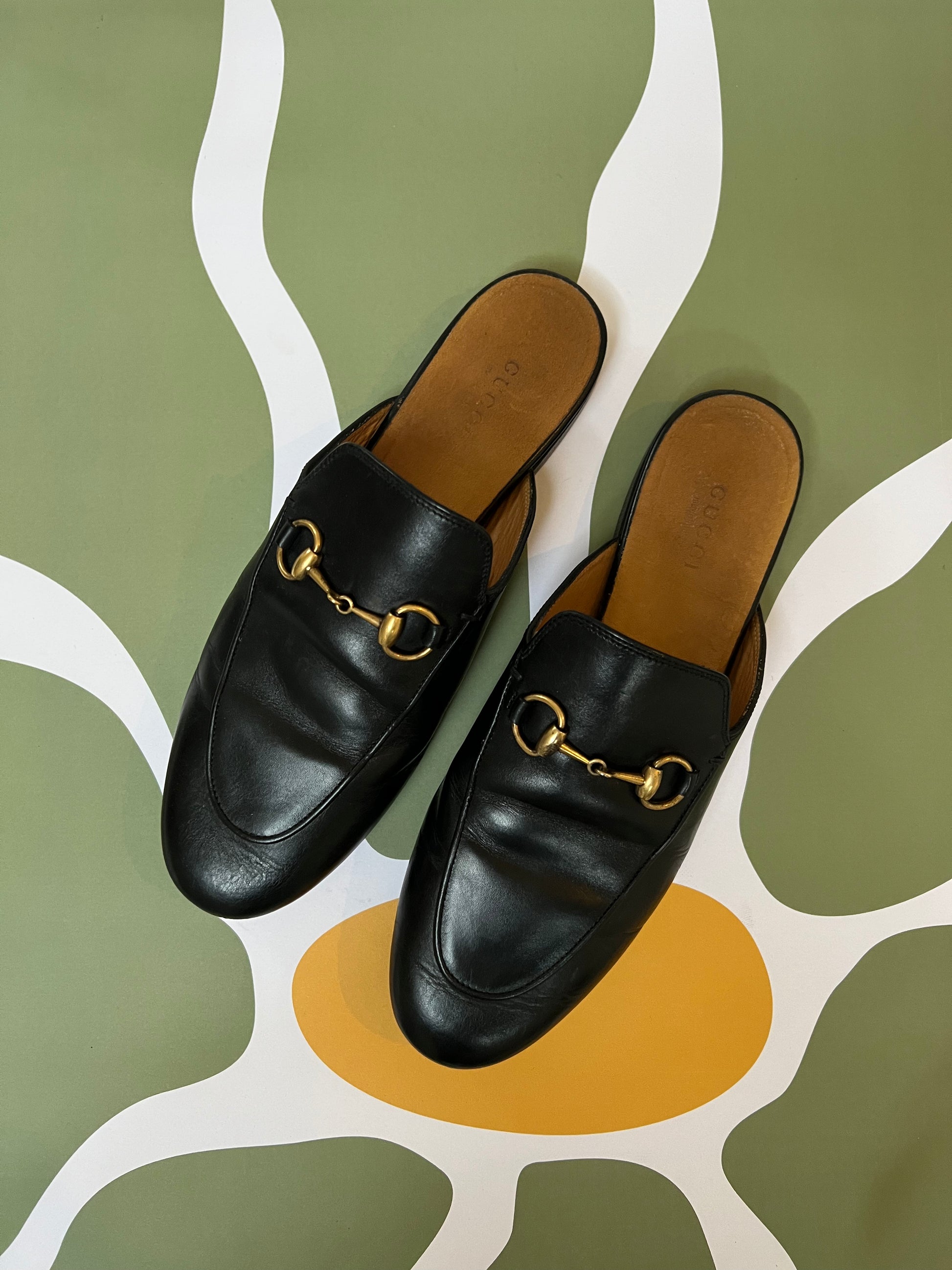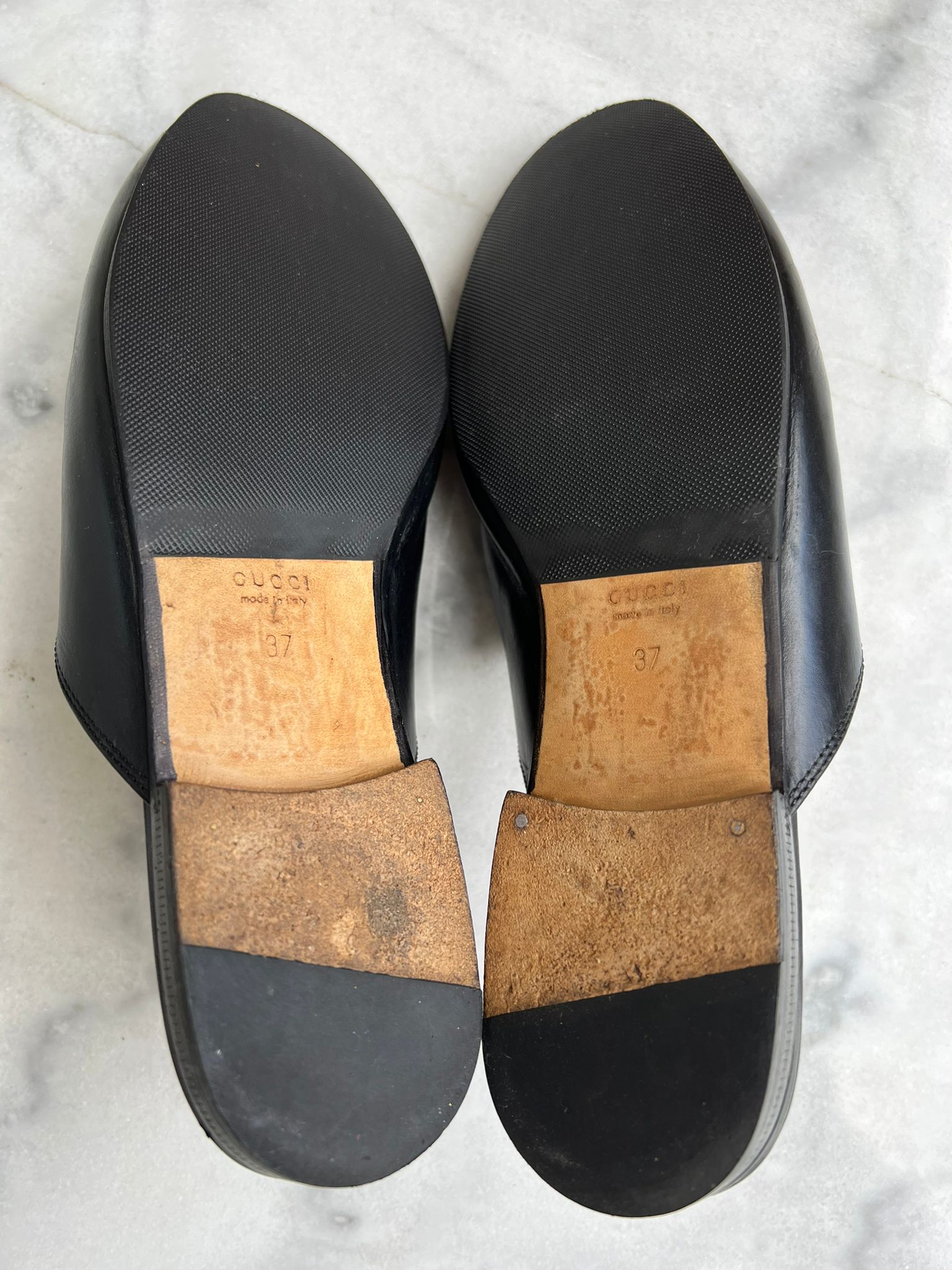 Beautiful Gucci Princetown flats in black leather. They have been worn a couple of times but are still in good condition. A protective sole has been added because leather soles are slippery and wear out fast. Some small signs of wear. The length of the sole is 25,5 cm measured on the outside. Comes with a Gucci box and dustbags.