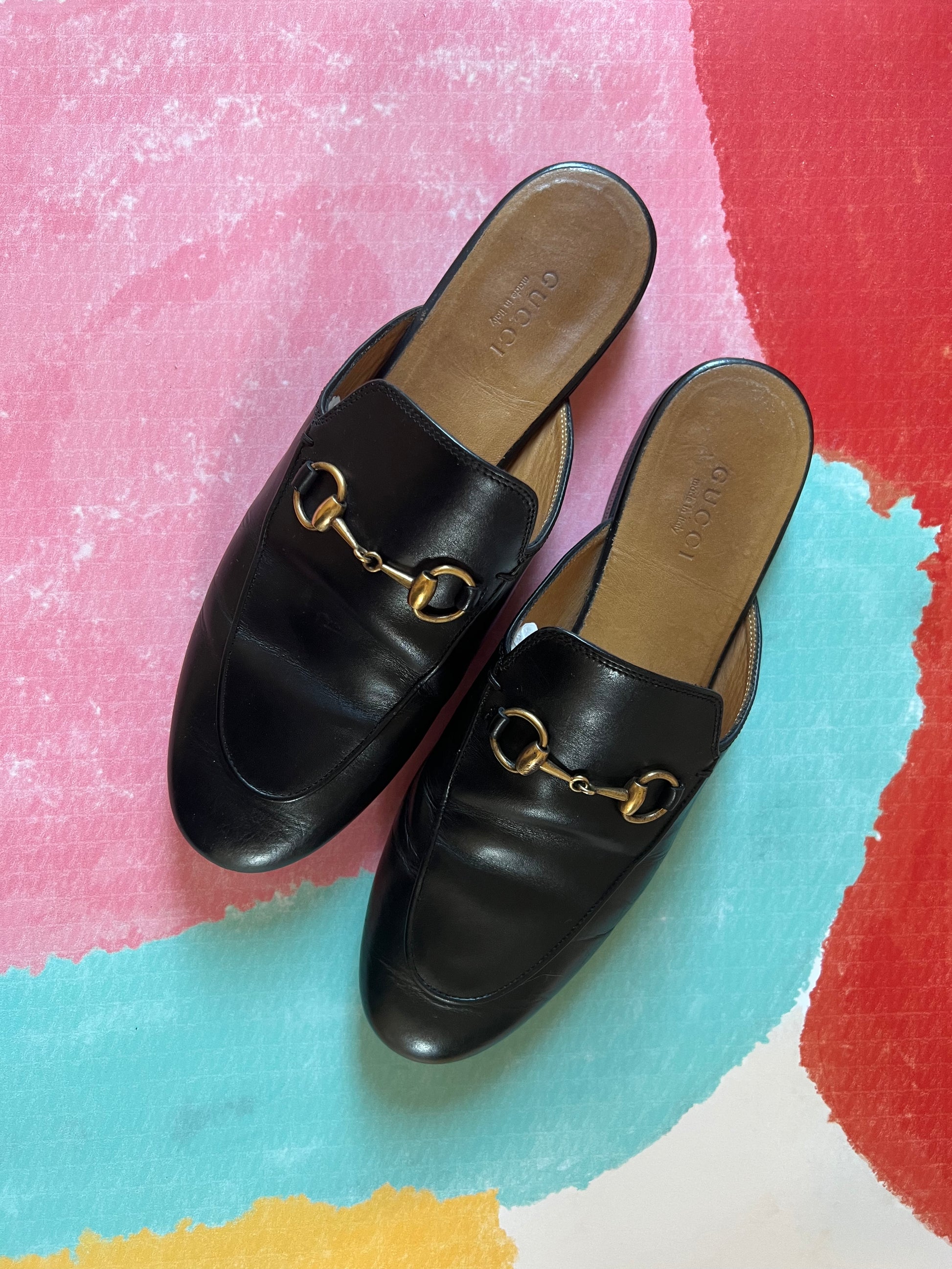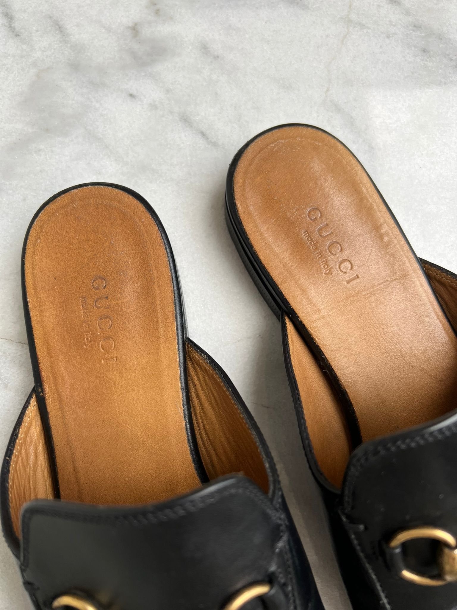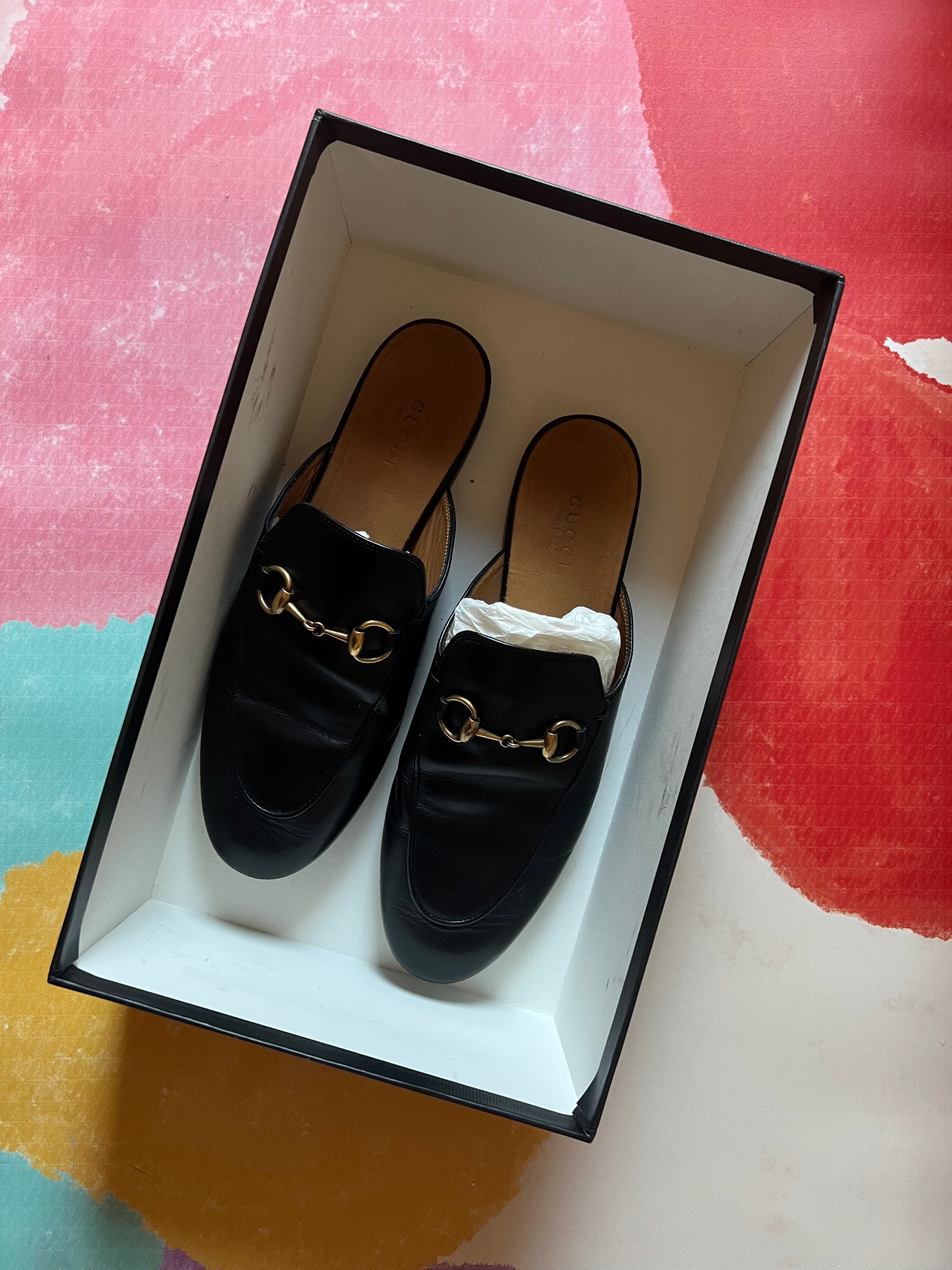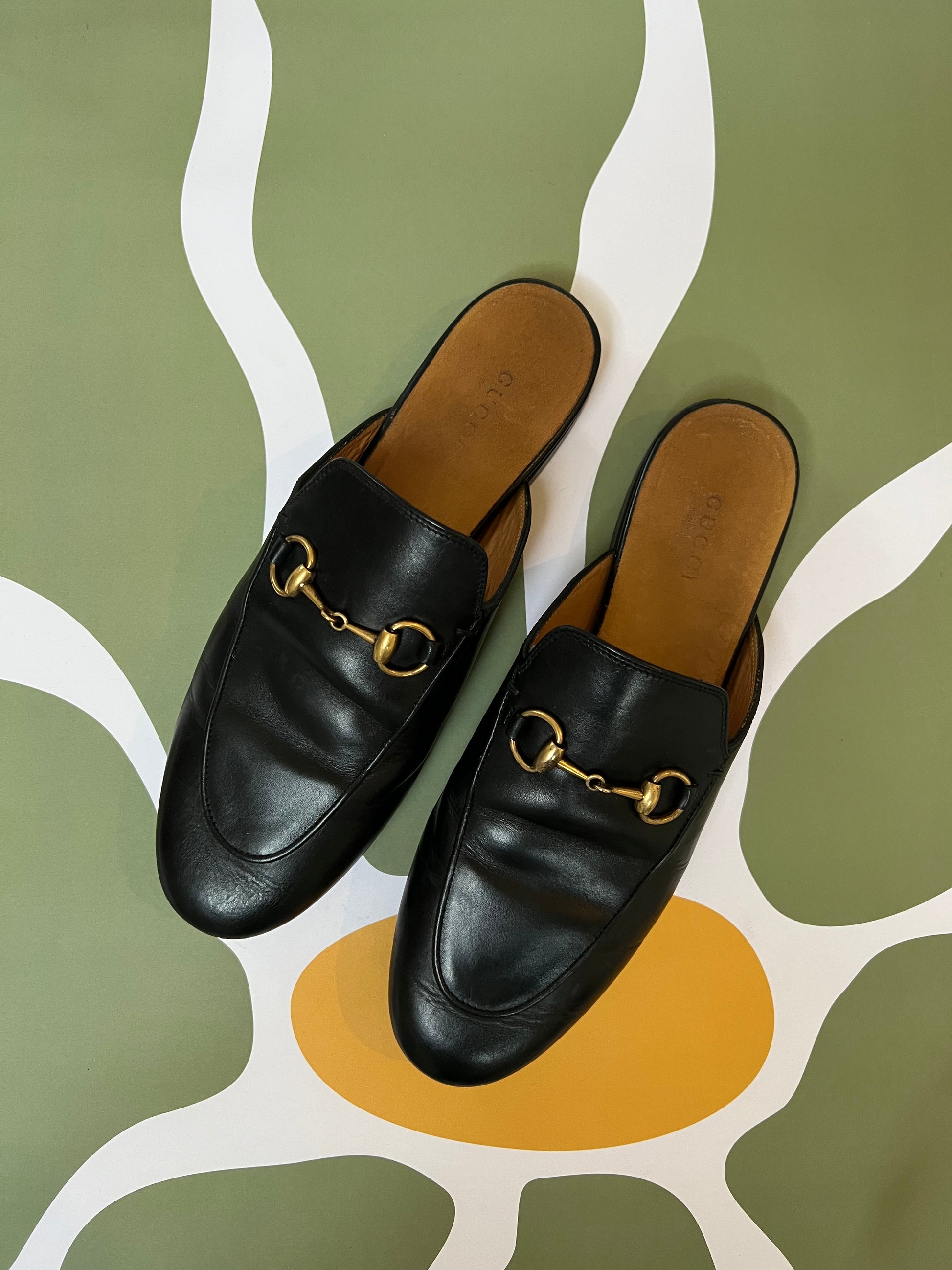 Beautiful Gucci Princetown flats in black leather. They have been worn a couple of times but are still in good condition. A protective sole has been added because leather soles are slippery and wear out fast. Some small signs of wear. The length of the sole is 25,5 cm measured on the outside. Comes with a Gucci box and dustbags.