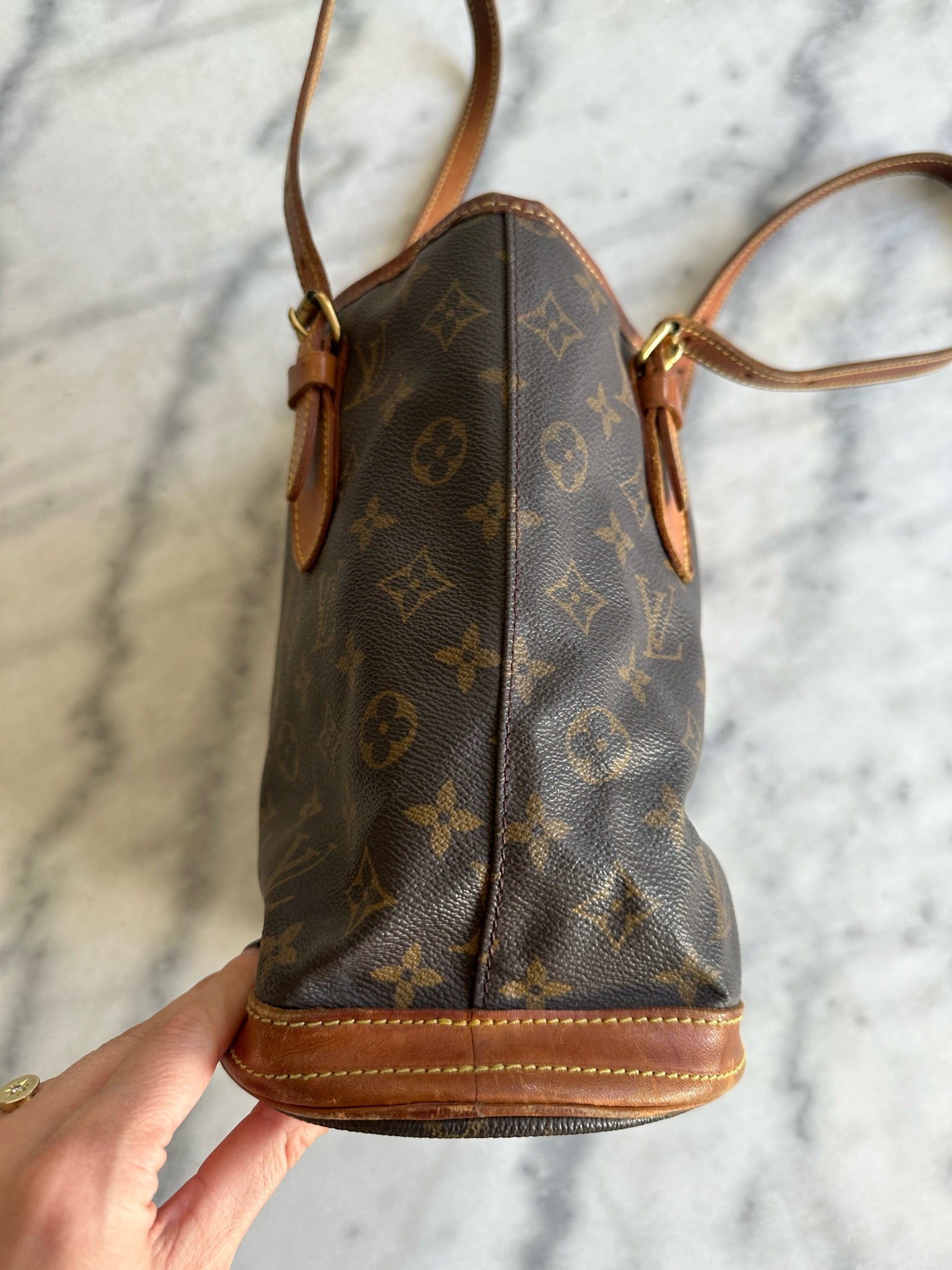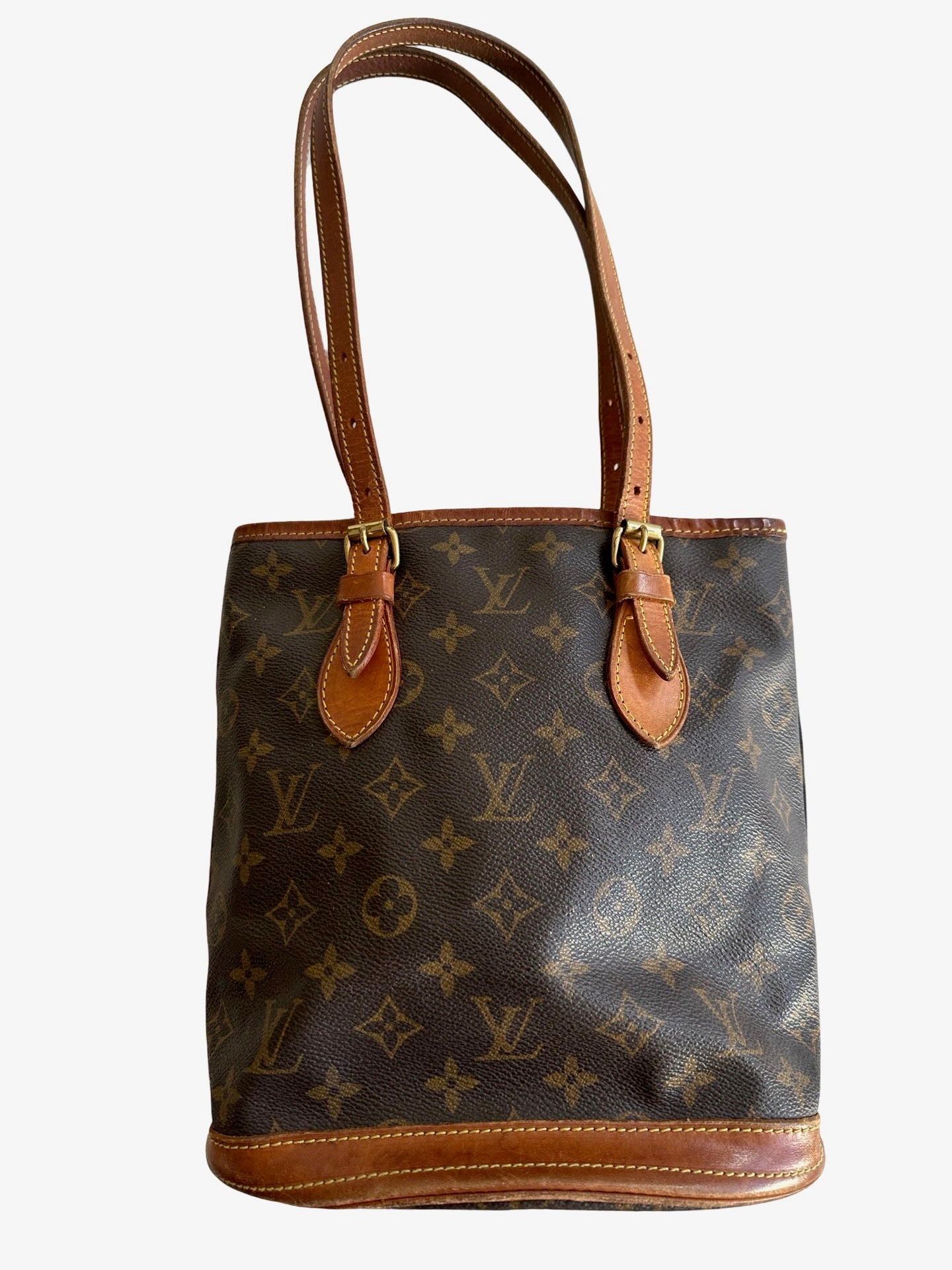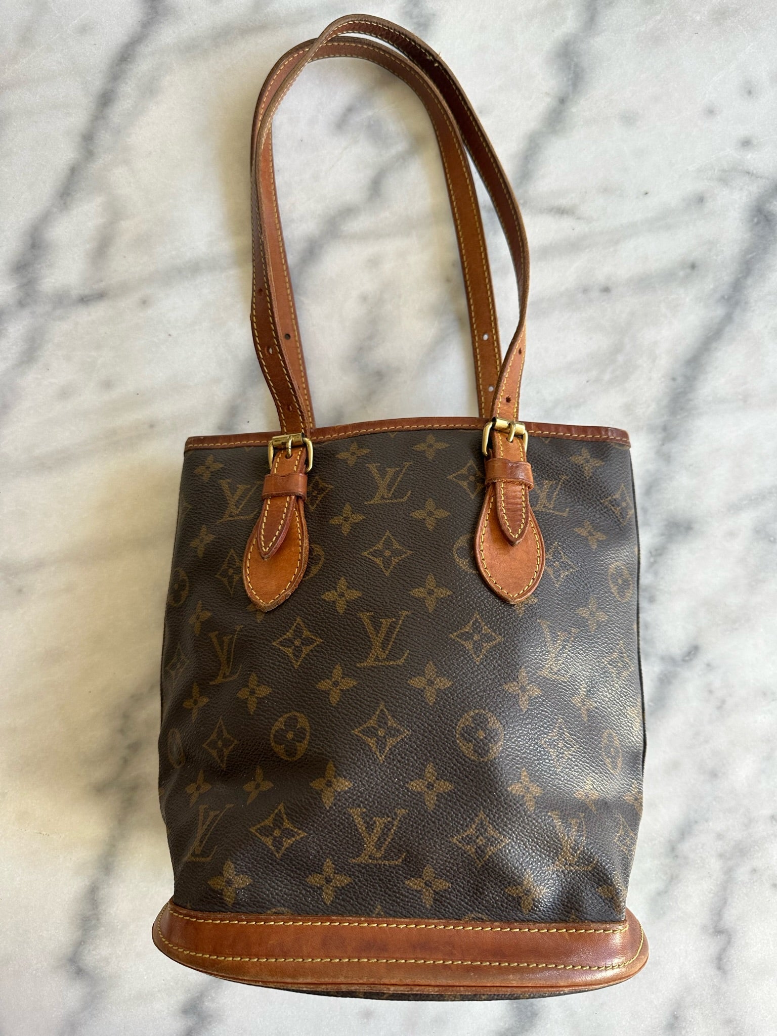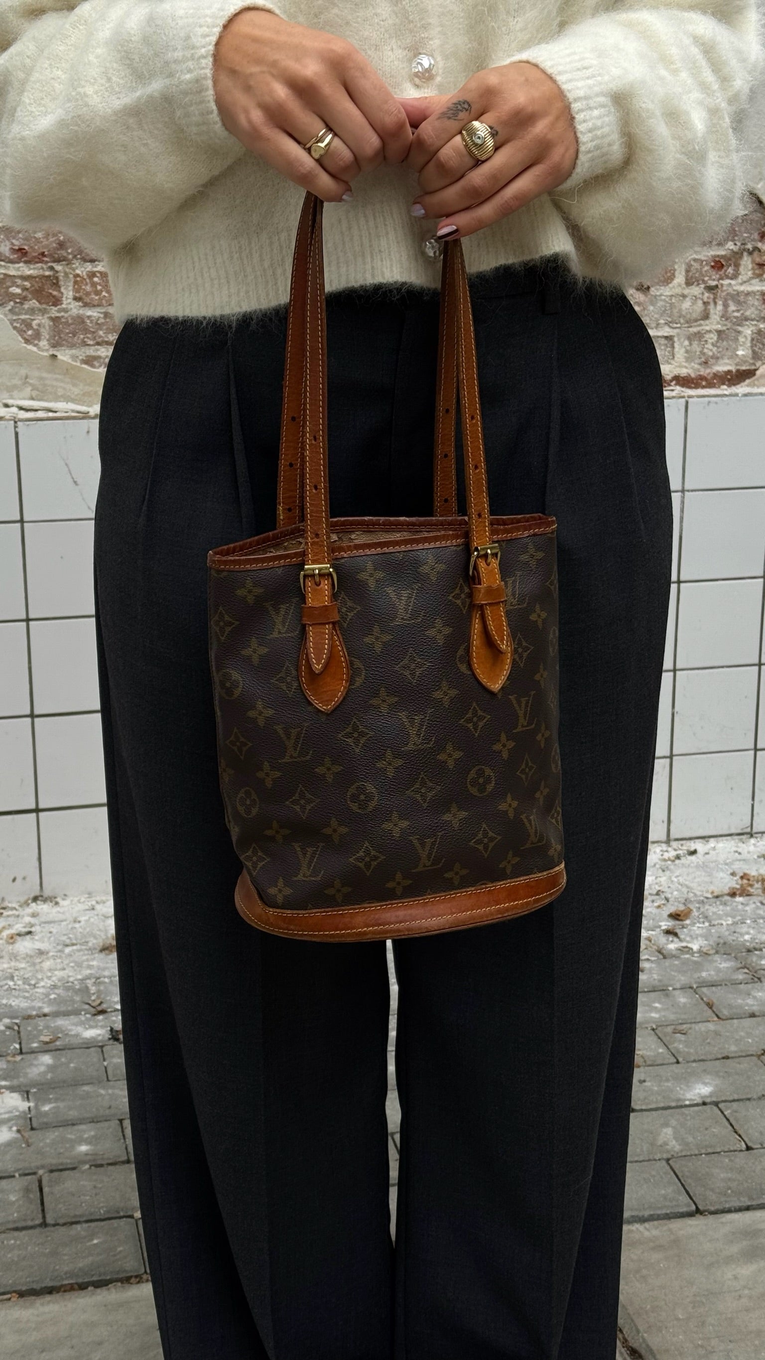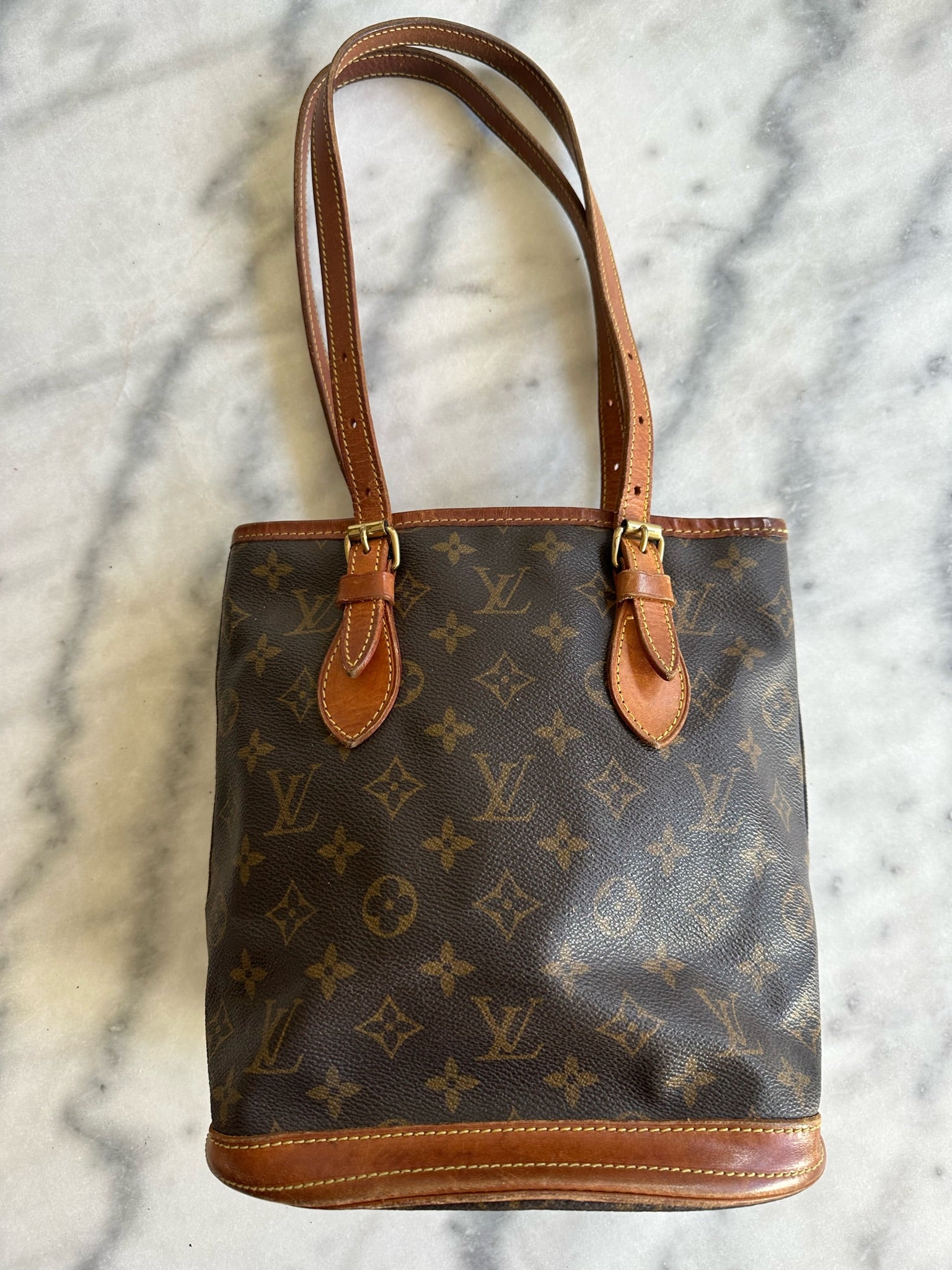Beautiful vintage Louis Vuitton bucket bag in brown leather. This bag has been worn and has some signs of wear mainly to the inside. The leather on the inside is a bit sticky and is coming loose. You can use a bag organizer inside the bag so you won’t notice it. On the outside still a beautiful bag. Please take a good look at the pictures.
