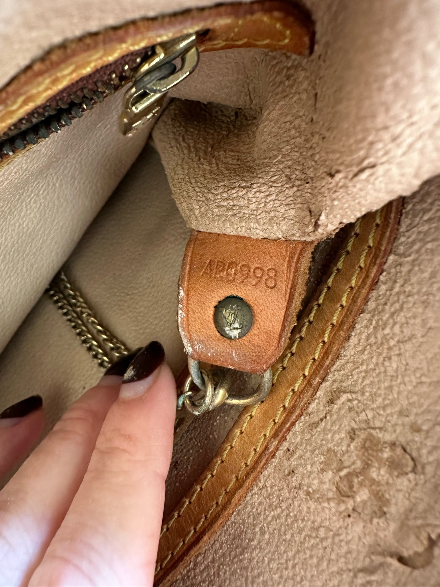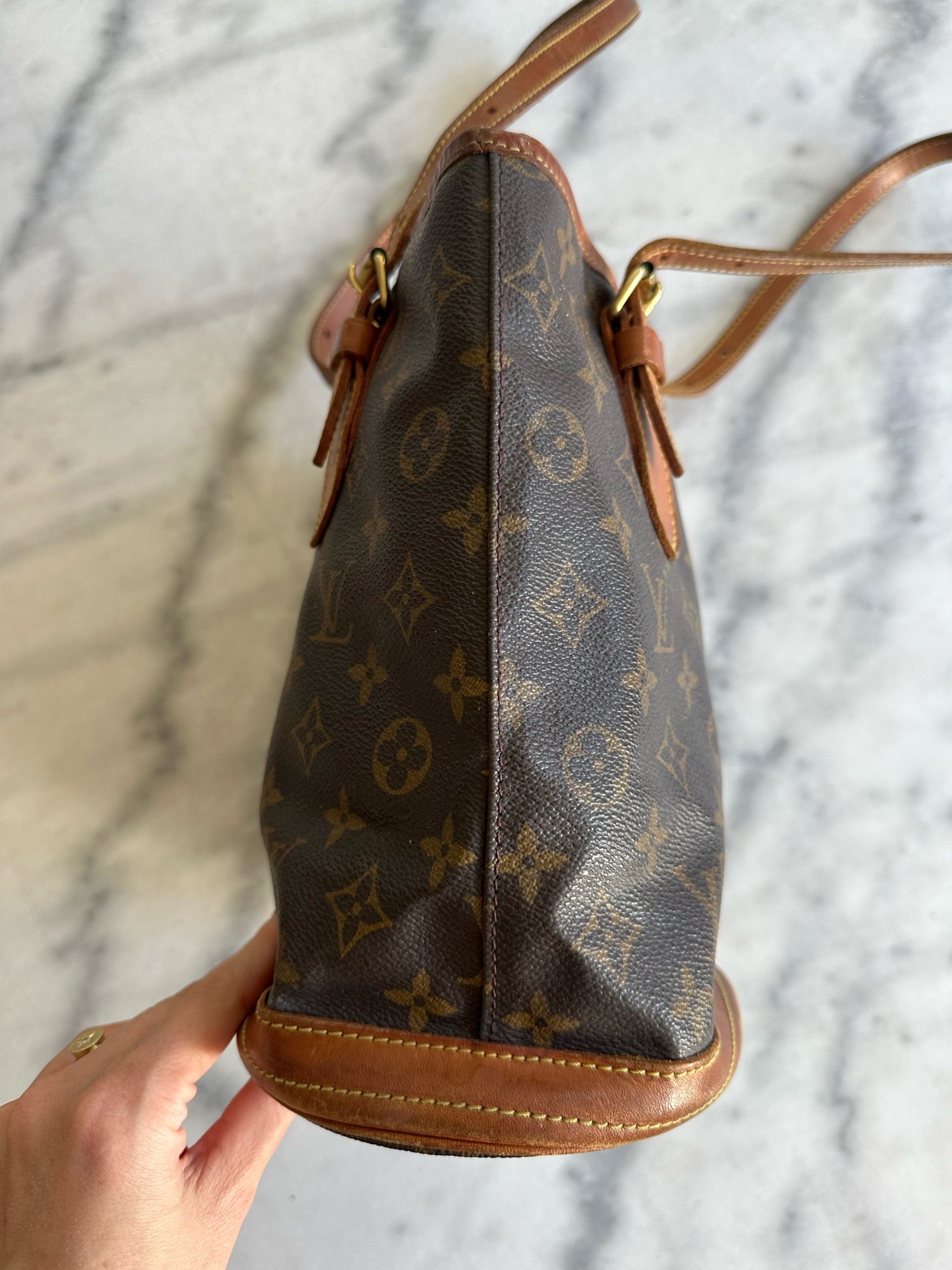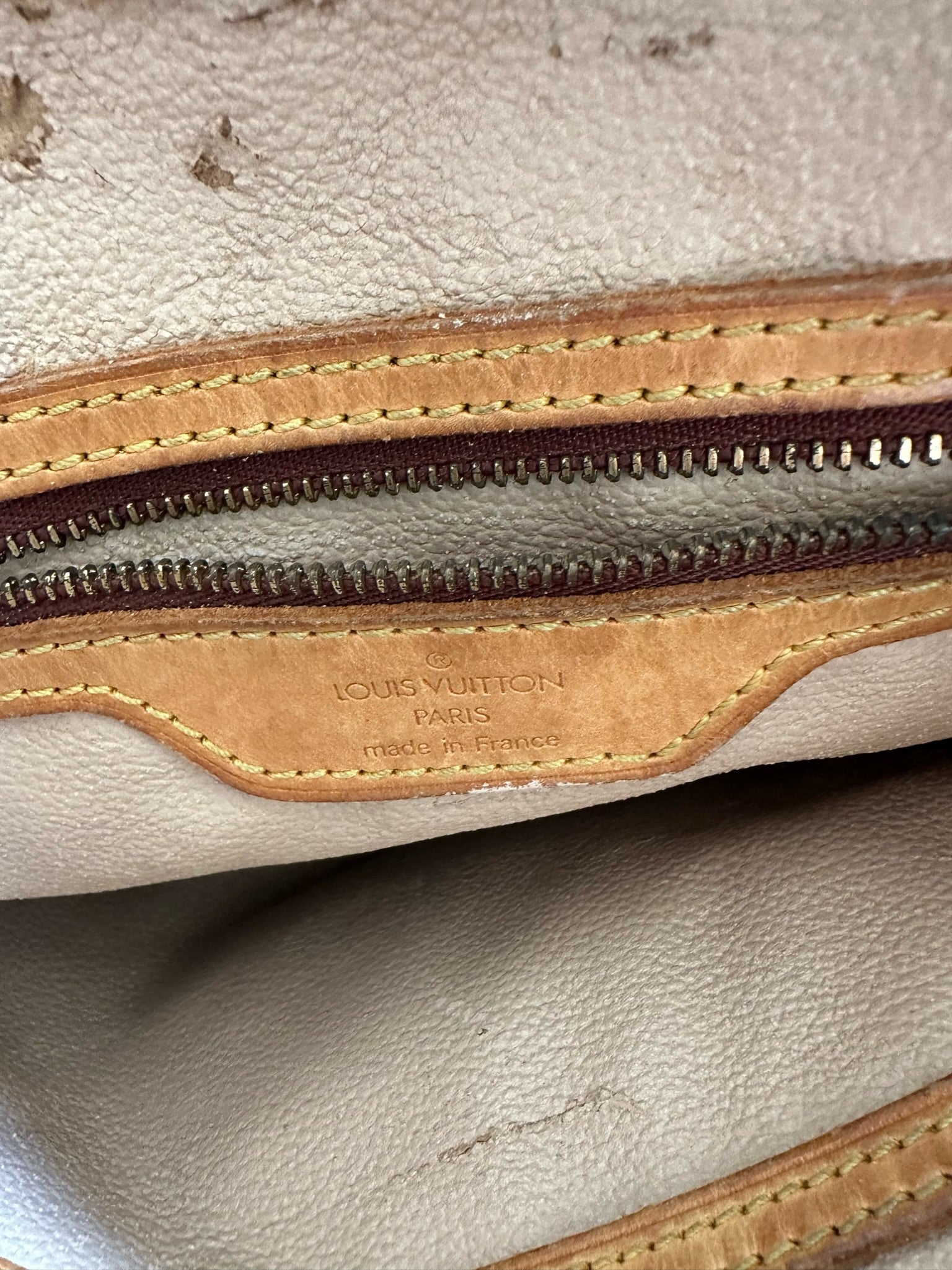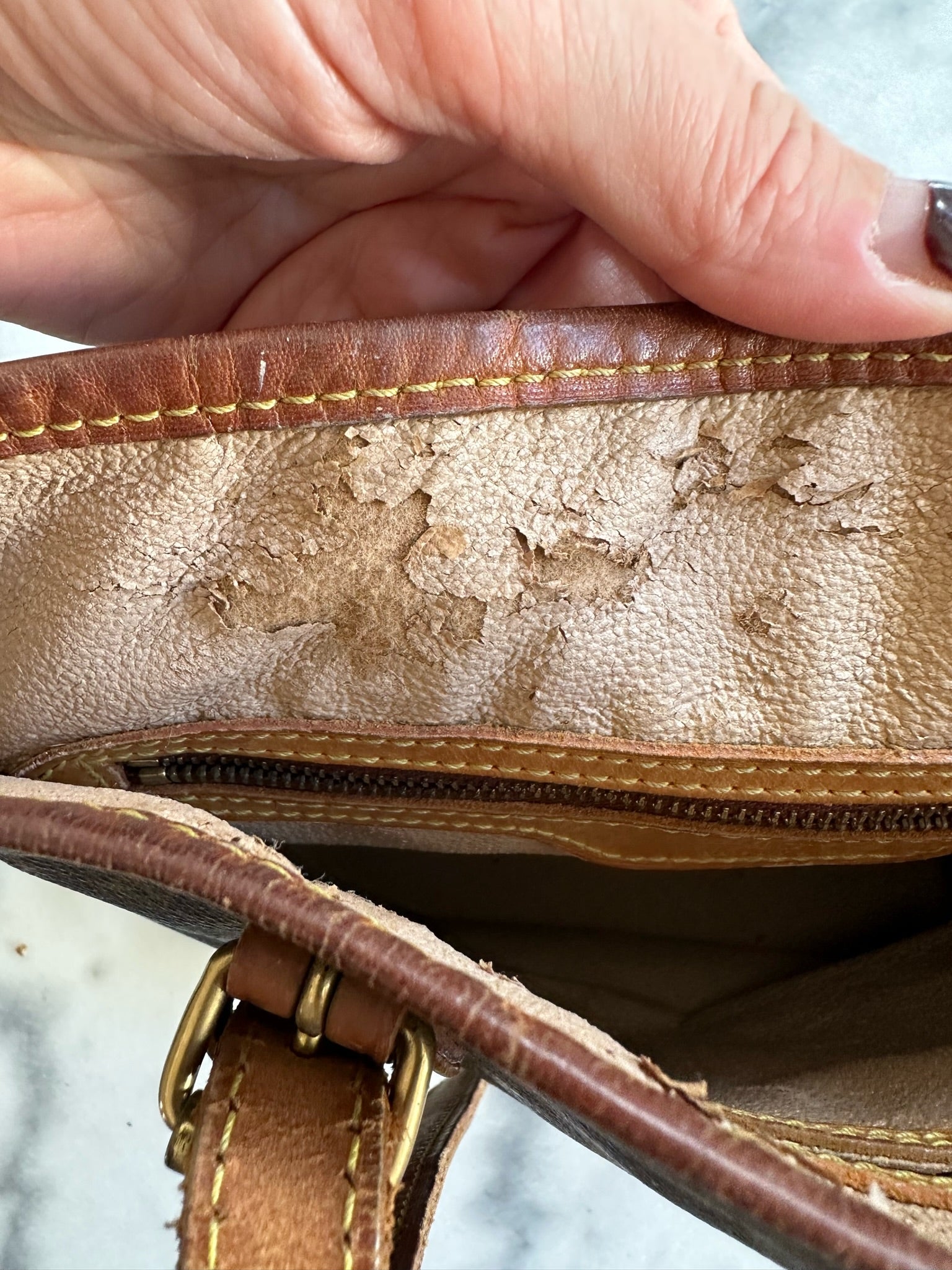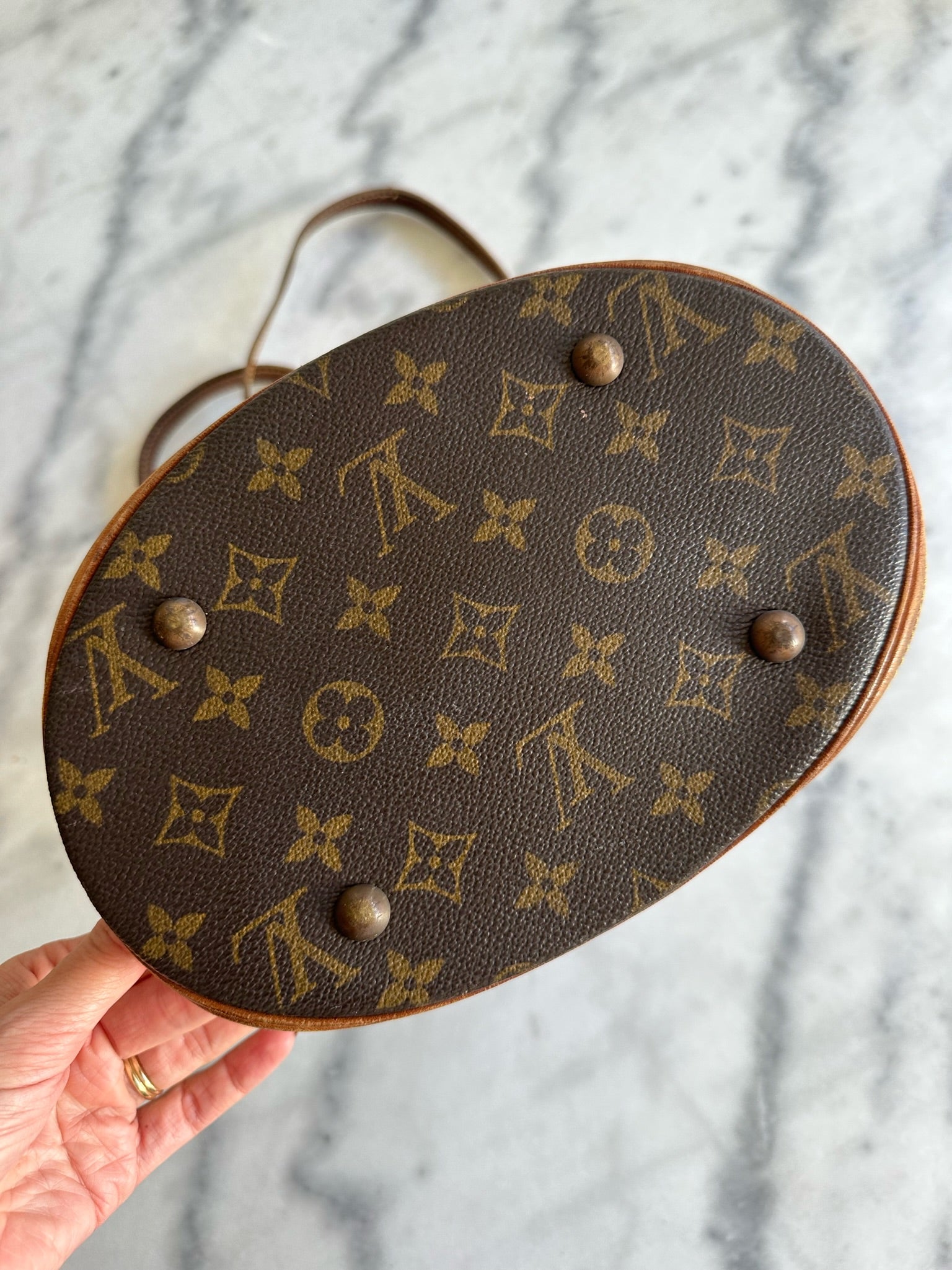 Beautiful vintage Louis Vuitton bucket bag in brown leather. This bag has been worn and has some signs of wear mainly to the inside. The leather on the inside is a bit sticky and is coming loose. You can use a bag organizer inside the bag so you won’t notice it. On the outside still a beautiful bag. Please take a good look at the pictures.