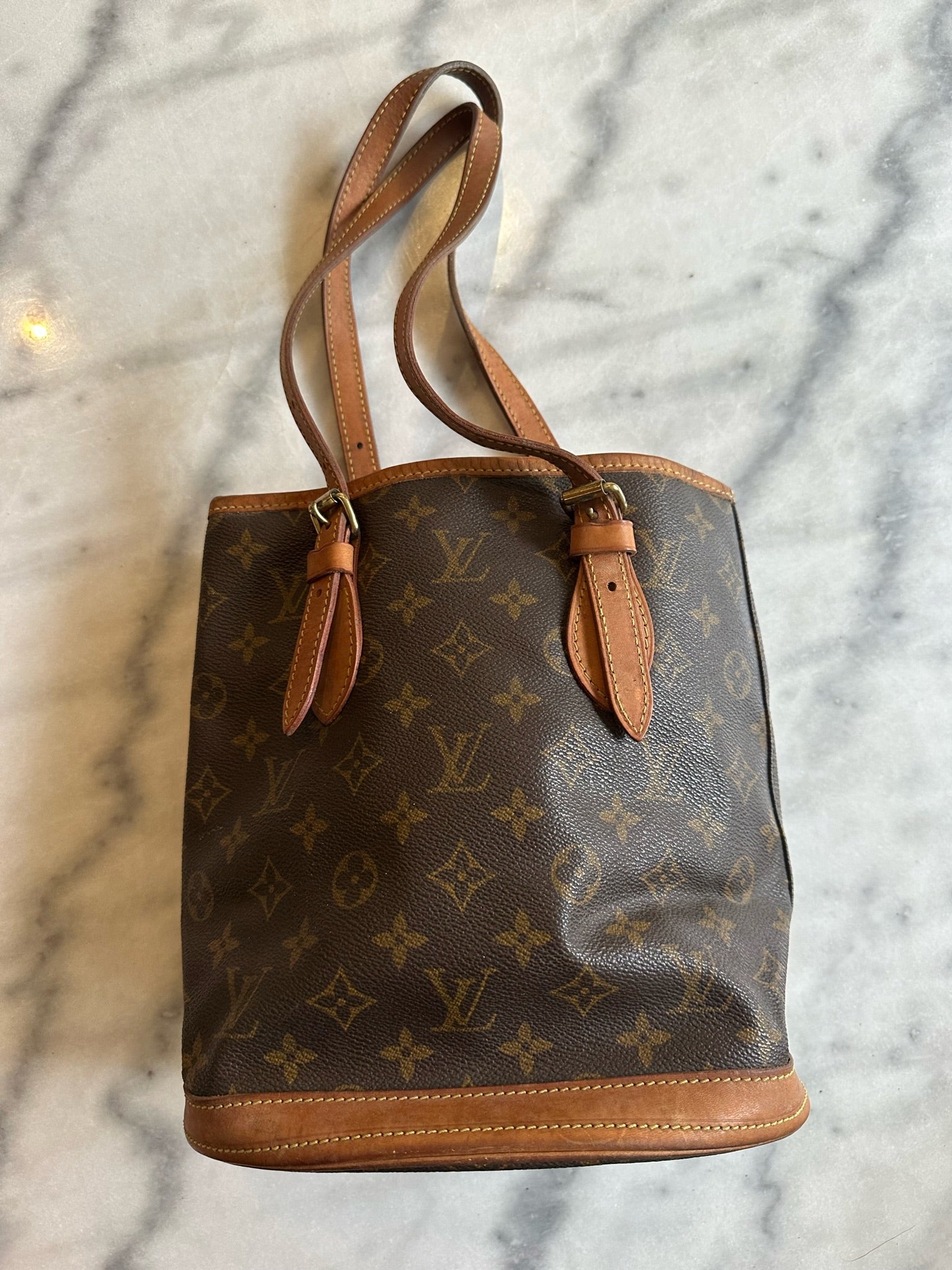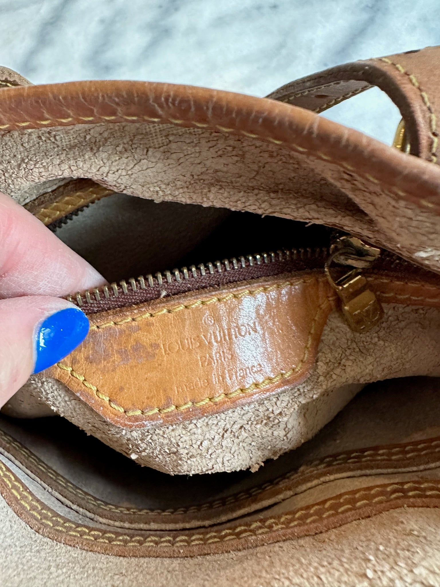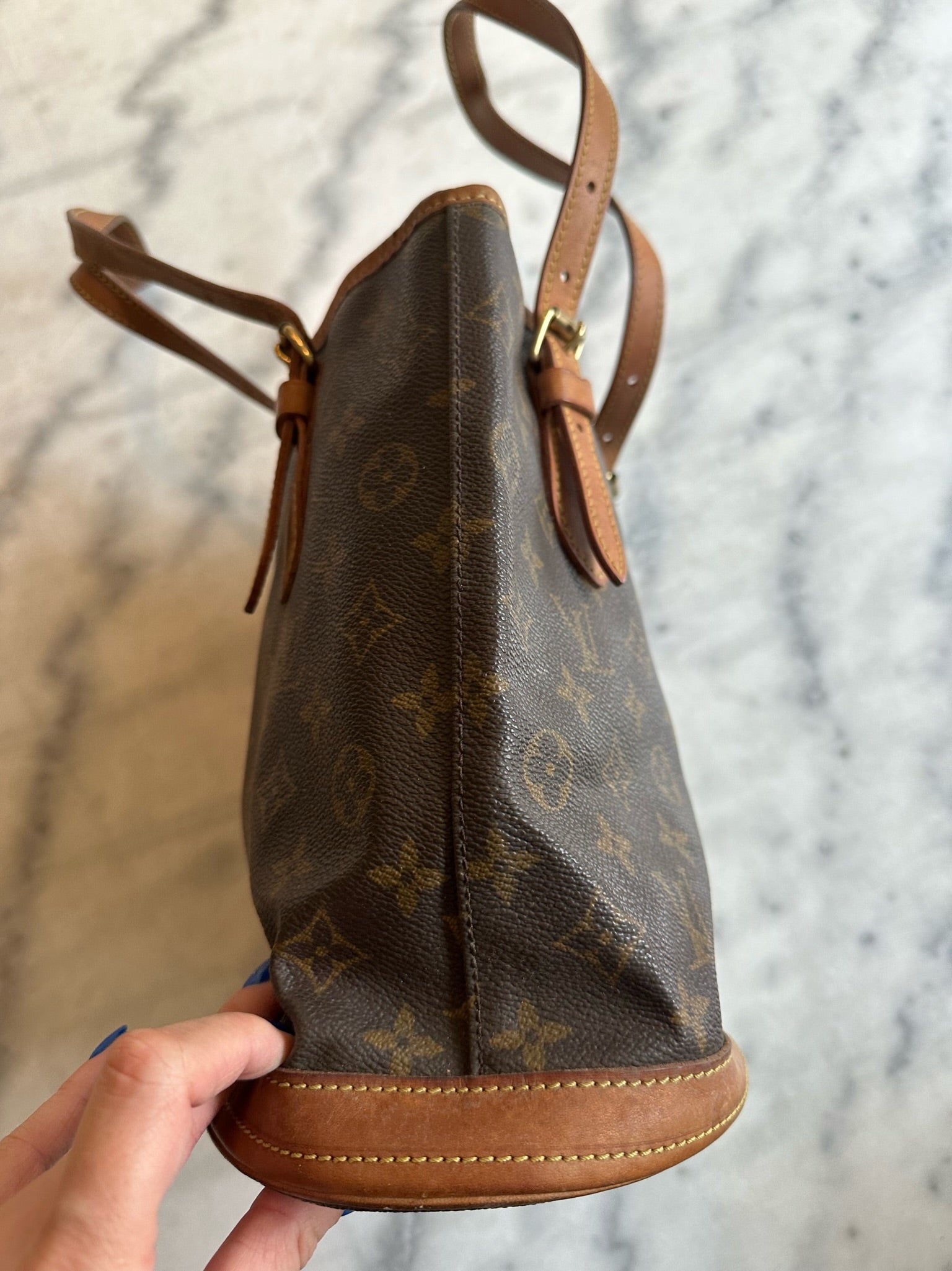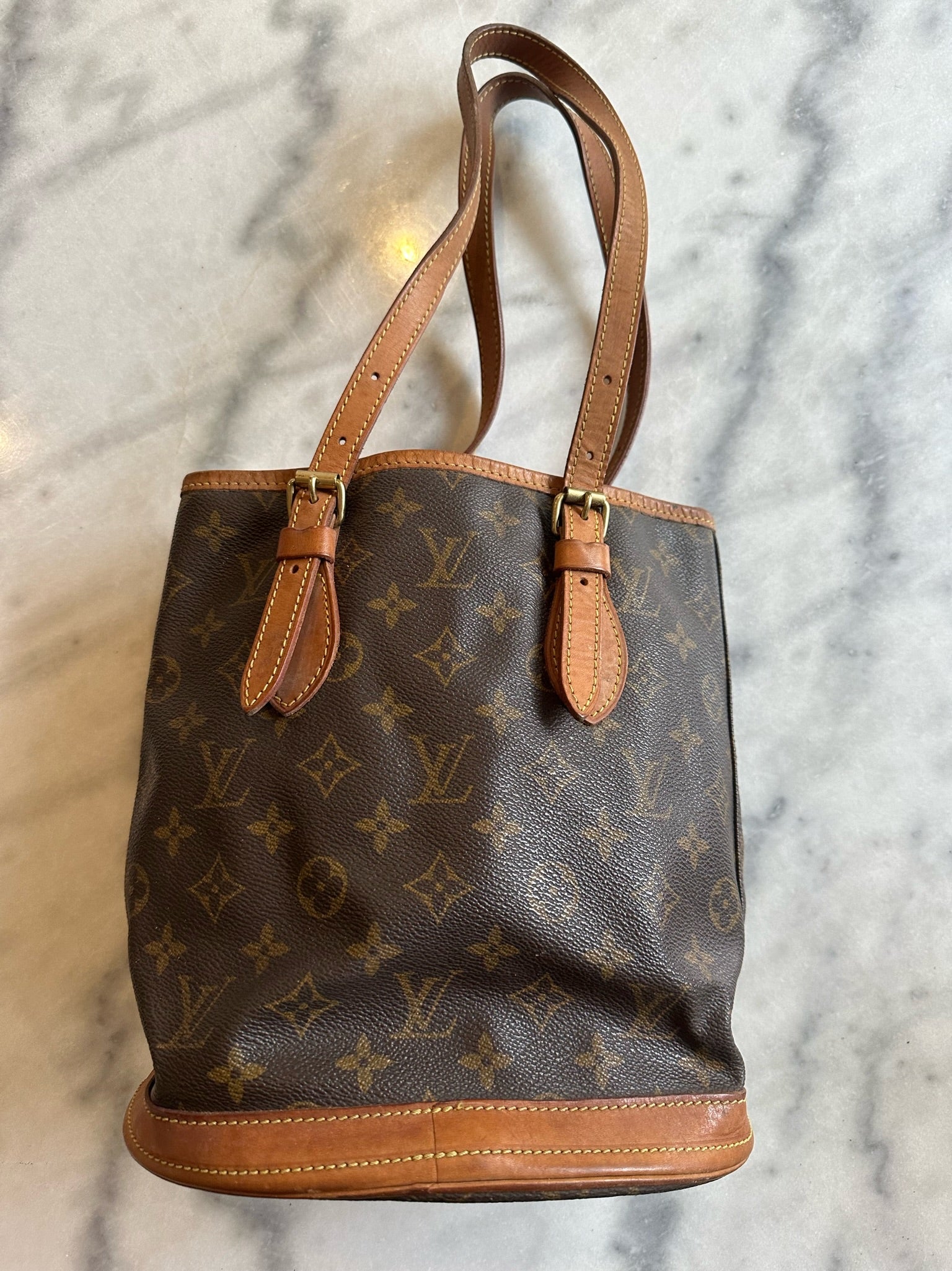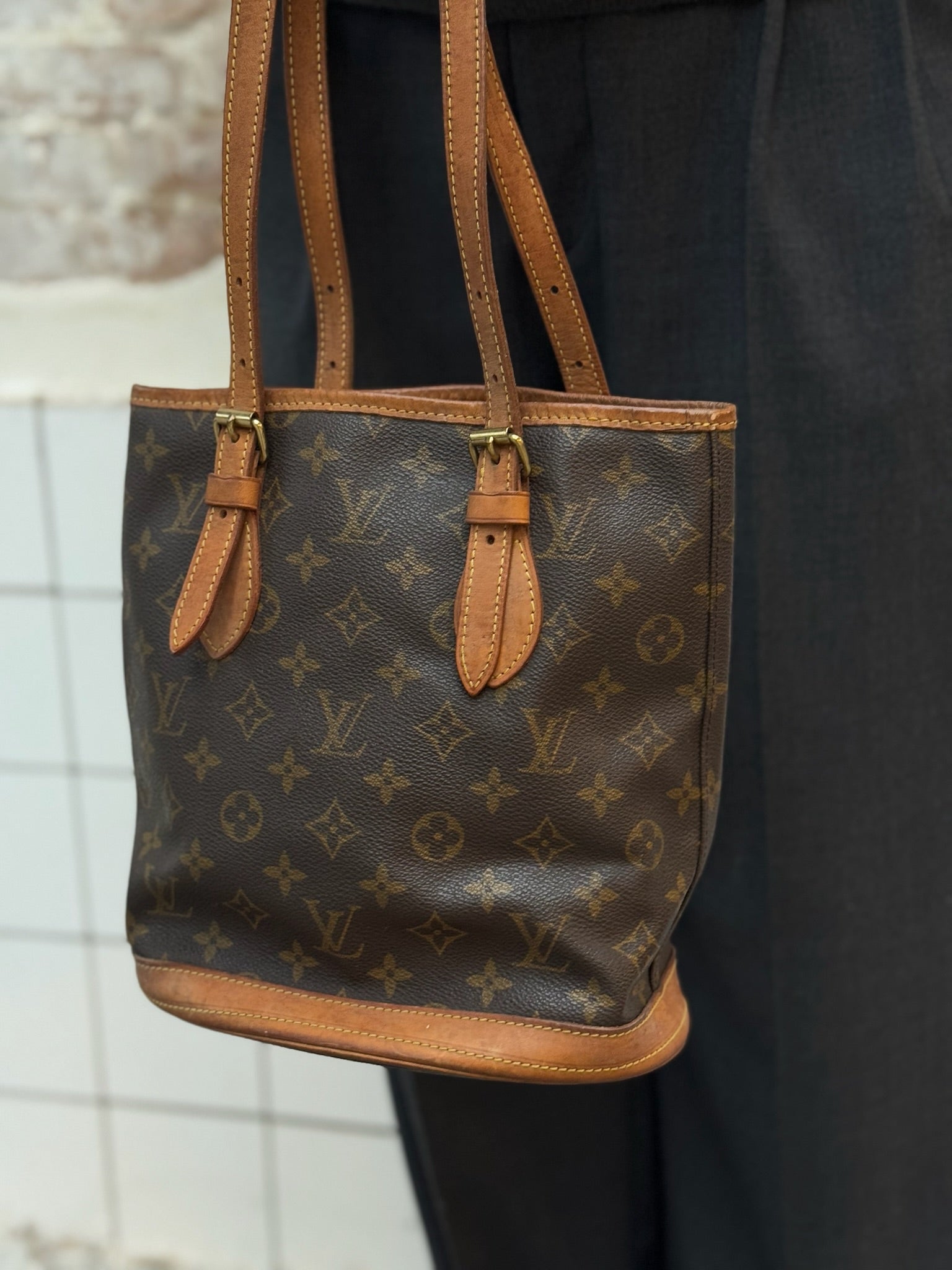 Beautiful vintage Louis Vuitton bucket bag in brown leather. This bag has been worn and has some signs of wear mainly to the inside. The leather on the inside is a bit sticky and is coming loose. You can use a bag organizer inside the bag so you won’t notice it. On the outside still a beautiful bag. Please take a good look at the pictures.