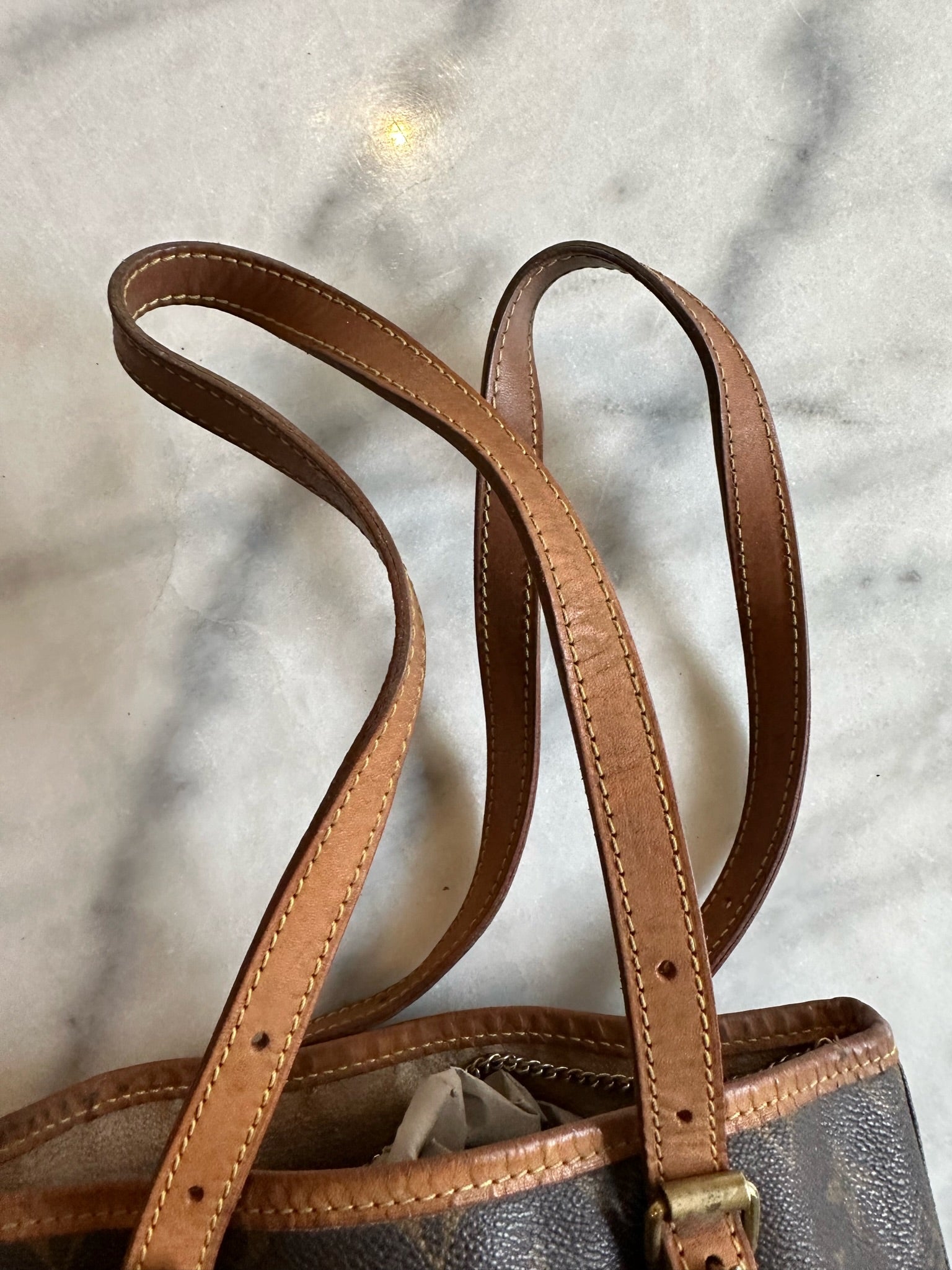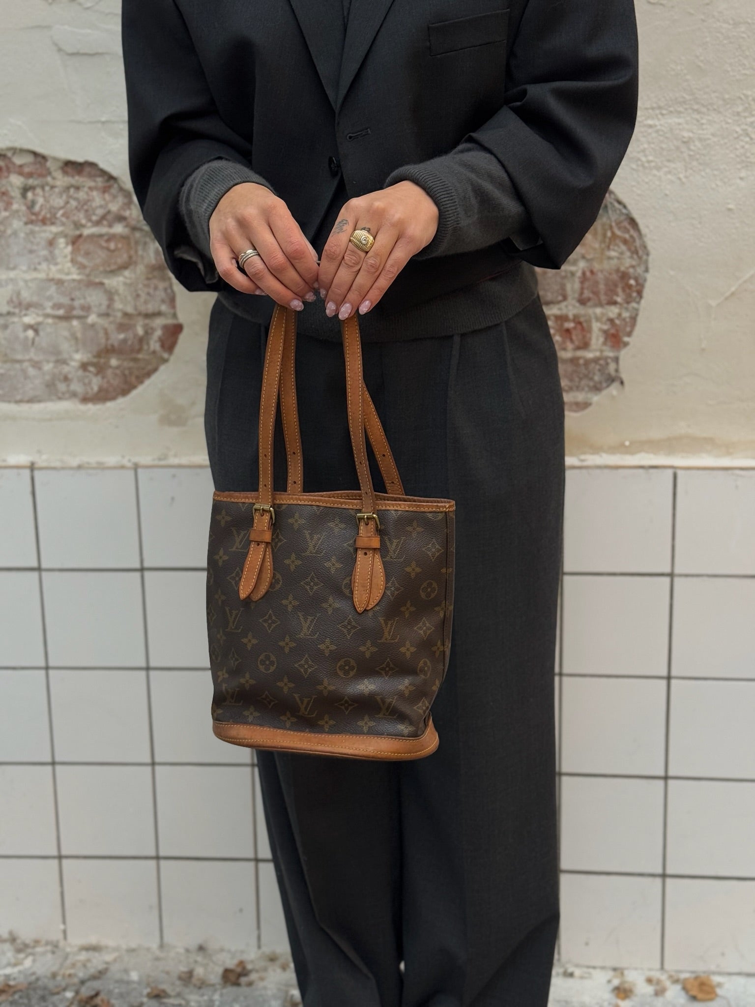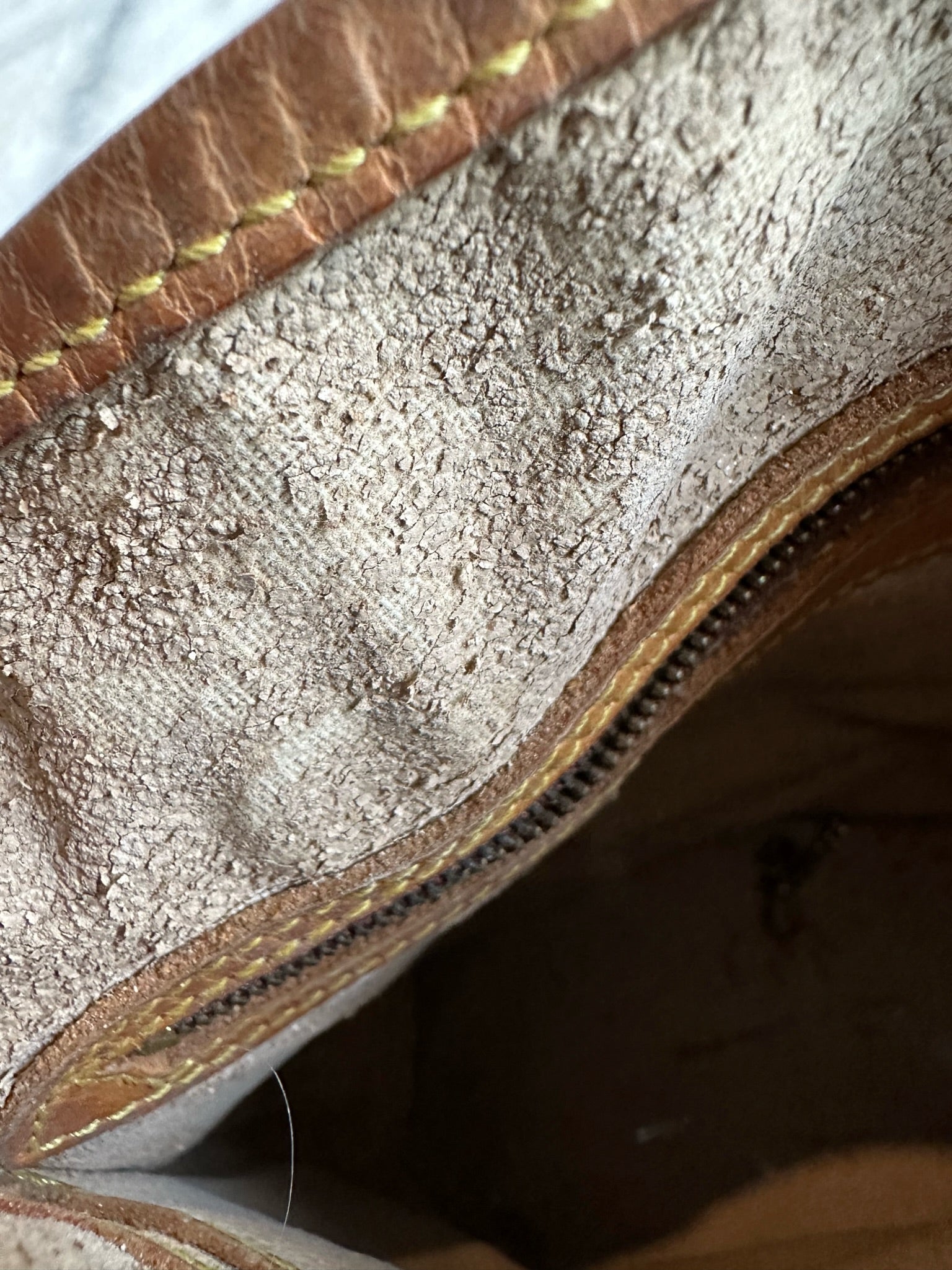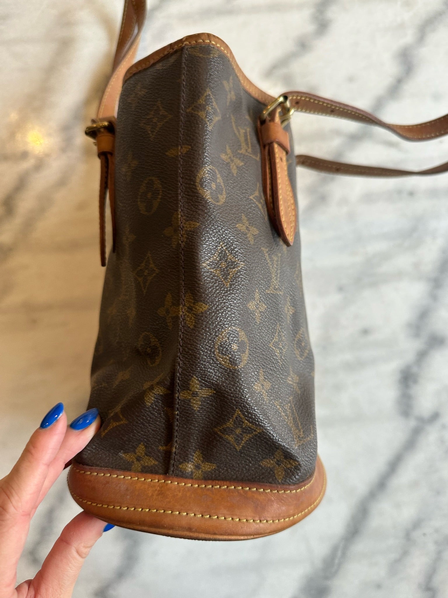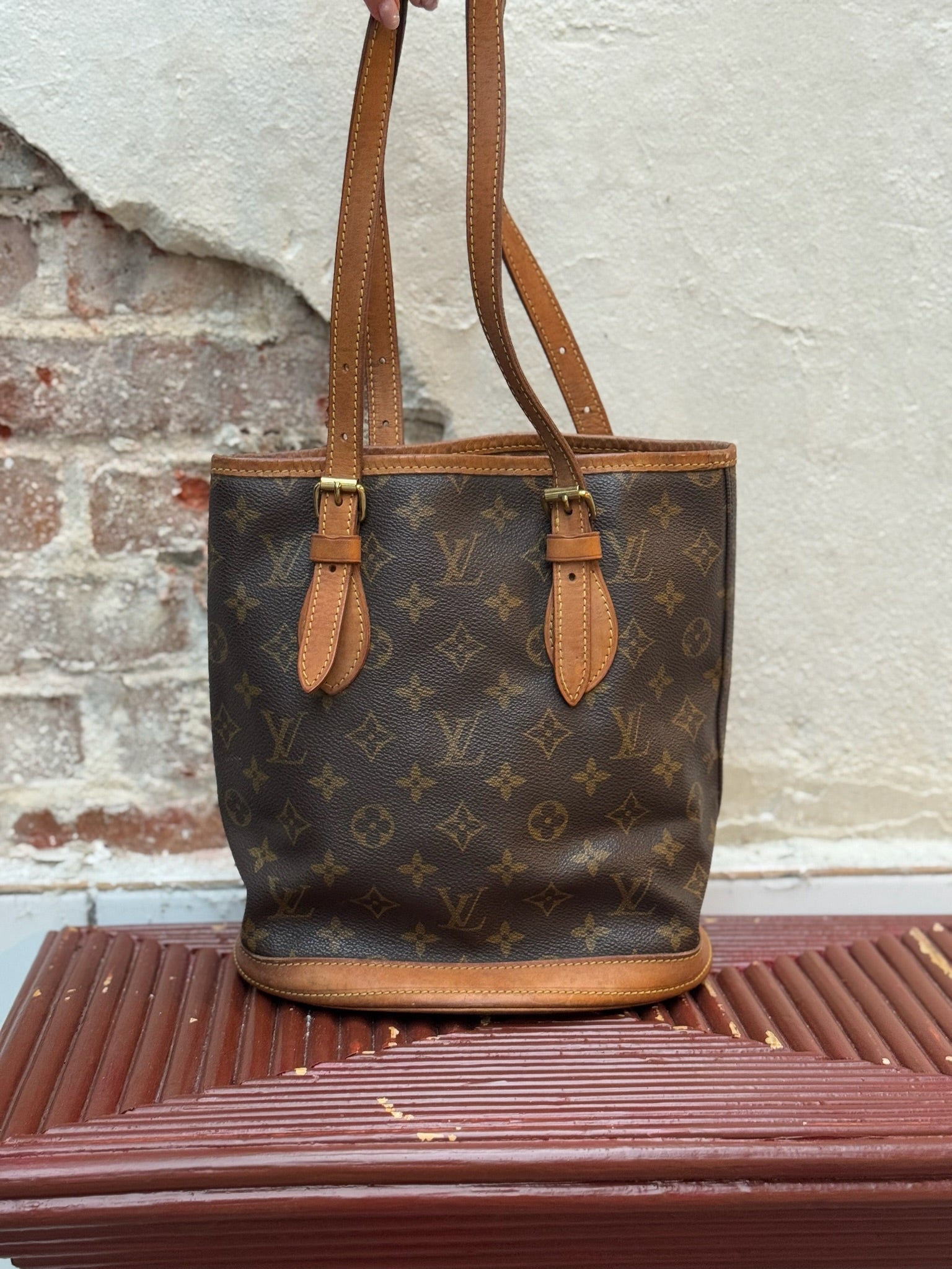 Beautiful vintage Louis Vuitton bucket bag in brown leather. This bag has been worn and has some signs of wear mainly to the inside. The leather on the inside is a bit sticky and is coming loose. You can use a bag organizer inside the bag so you won’t notice it. On the outside still a beautiful bag. Please take a good look at the pictures.