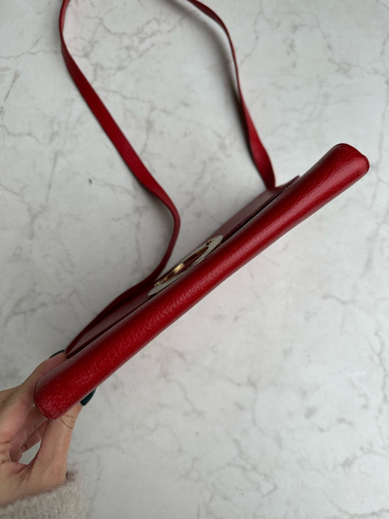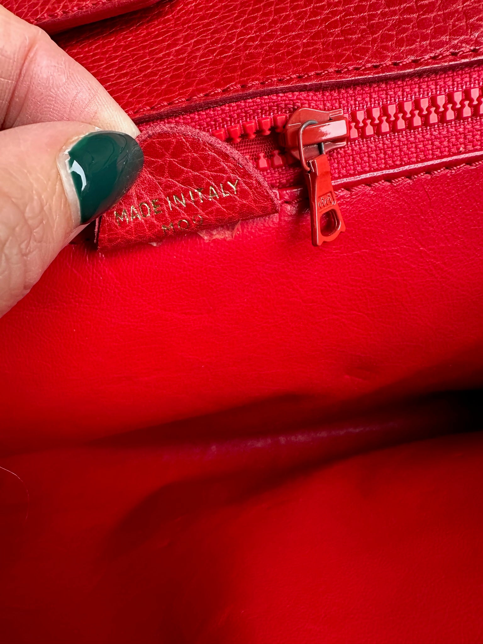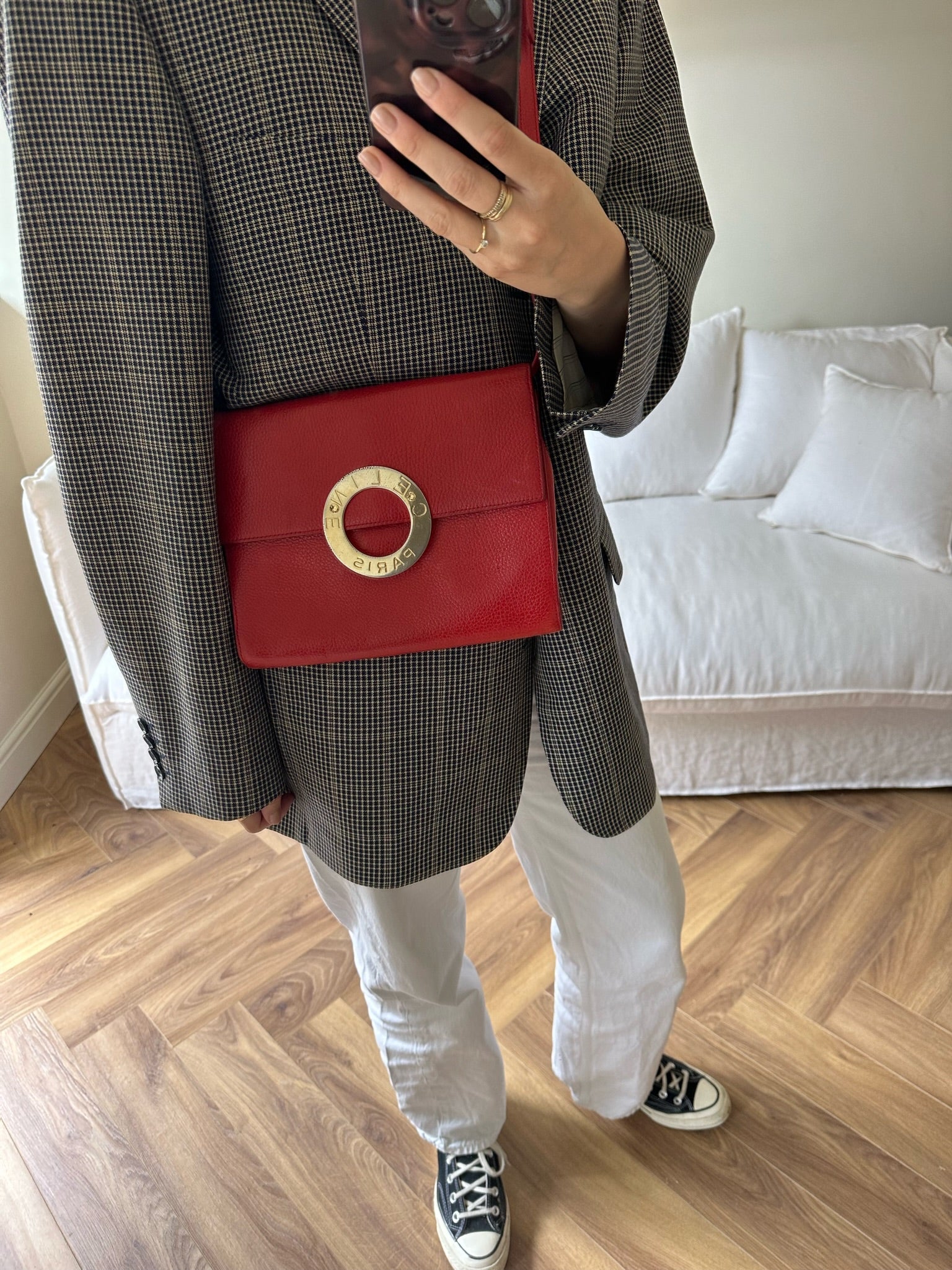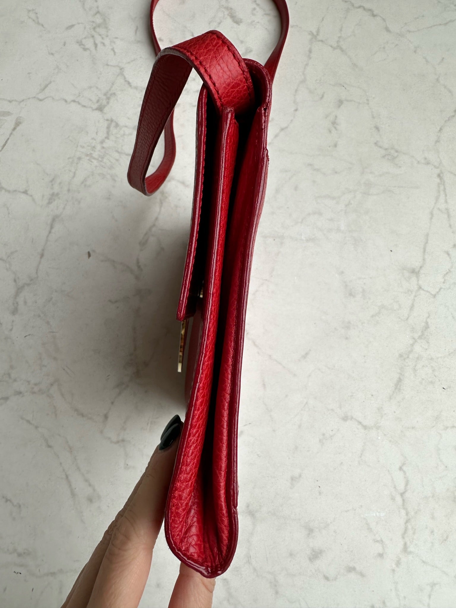 Beautiful vintage Celine triomphe bag in red leather with gold hardware. Some small wear to the hardware the leather and to the corners. Comes without dustbag and box. Can be worn on the shoulder and crossbody. 25 cm wide 19 cm high