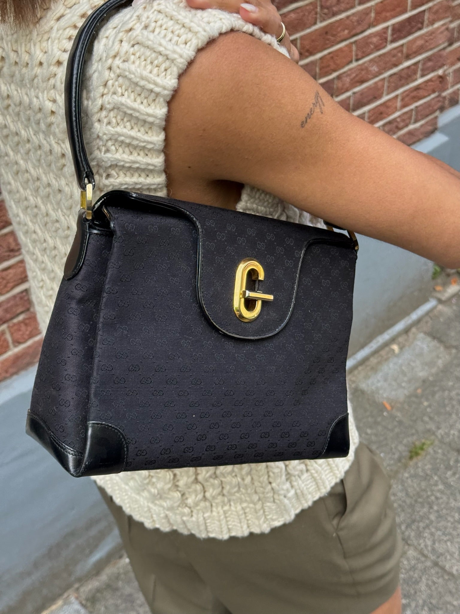 Beautiful vintage Gucci handbag in black leather and canvas. The bag has gold hardware. There is some small wear to the leather and hardware. Overall still in very good condition. Can be worn on the shoulder. 24 cm wide 19 cm high