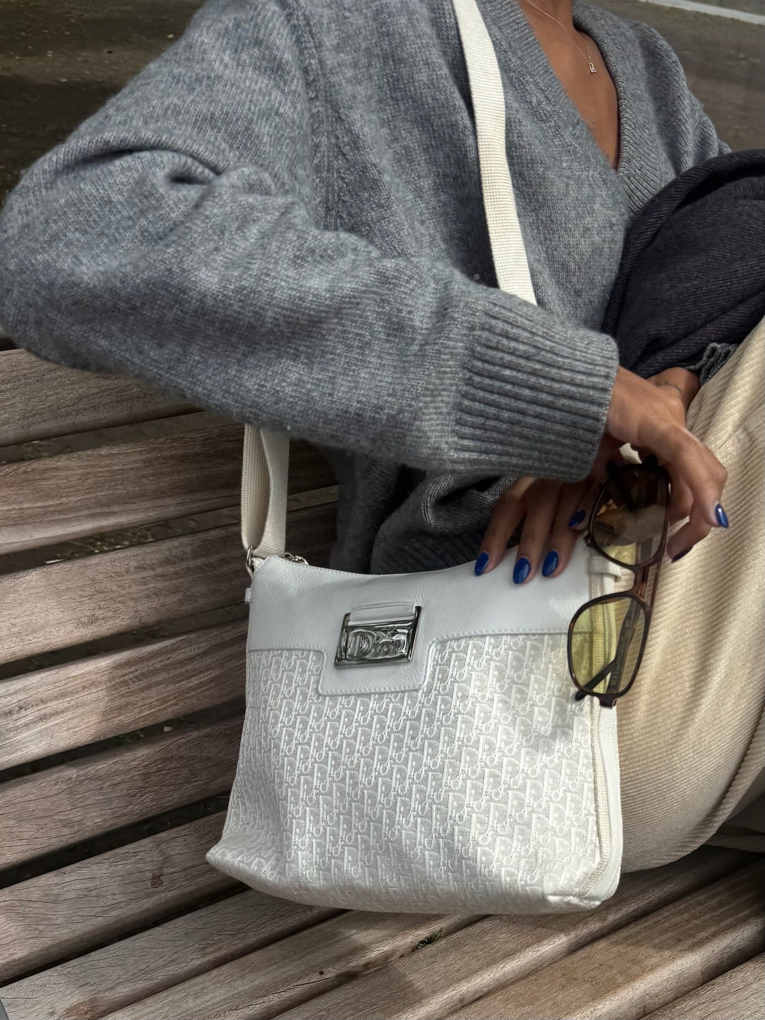 Beautiful vintage Dior bag in white beige canvas and leather. Some signs of wear to the canvas and hardware. Overall still in good condition. Can be worn crossbody or as a schouder bag. The strap is adjustable. Comes without dustbag. 29 cm wide 25 cm high